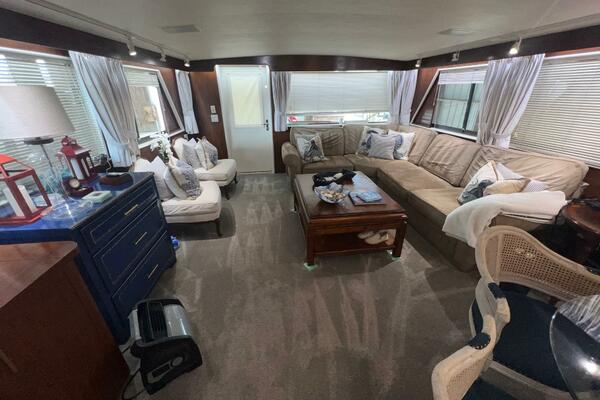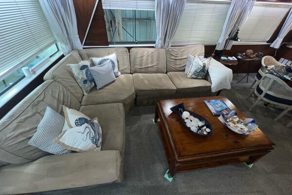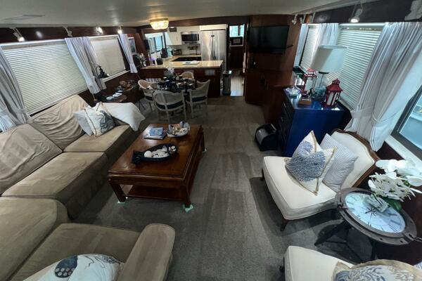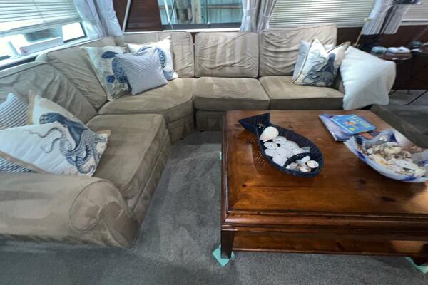 If you continue aft through the door, you will enter into the large galley which features full-size appliances, granite countertops, plentiful storage. Conveniently located across from the galley is a huge dinette that can seat many of your friends and family. The galley's breakfast bar opens into the spacious, tastefully decorated salon which features a large sectional sofa and abundant windows offering exceptional views and natural light. The aft deck can be accessed from here via a door on the starboard side.