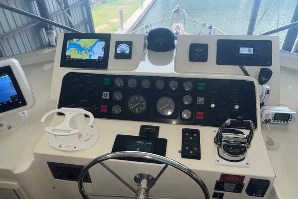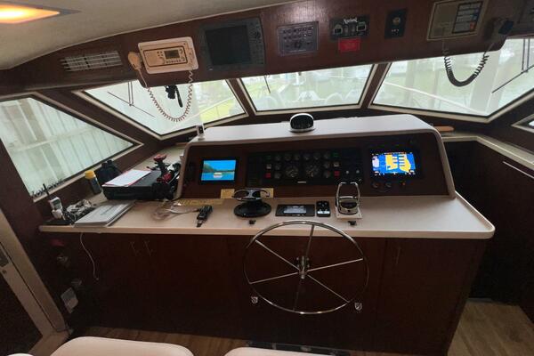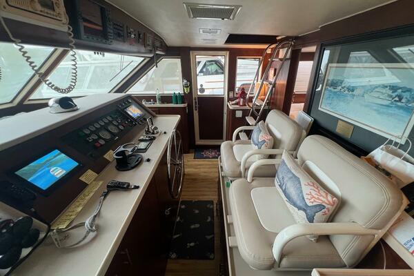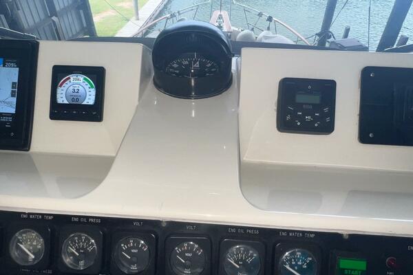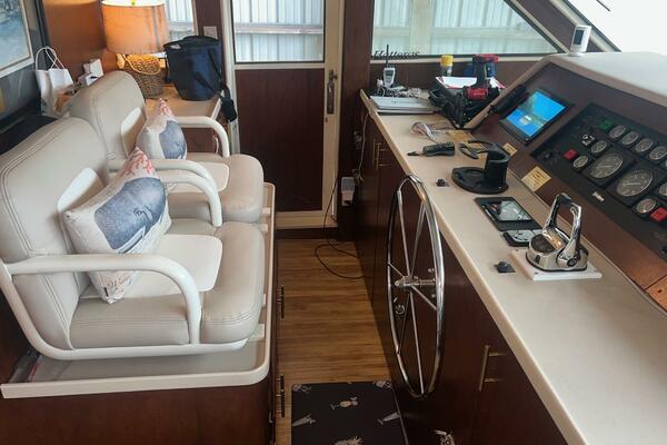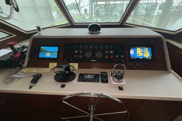 Hatteras flush deck wheelhouses are hard to beat. They have excellent visibility, plenty of vertical dash space to flush-mount the navigational electronics and sliding pilothouse doors port and starboard. These doors allow direct access to the forward side decks, making single-handed docking a breeze. From this area you will find a ladder leading to the large flybridge, a doorway leading to the galley and a stairway leading to the accommodations.