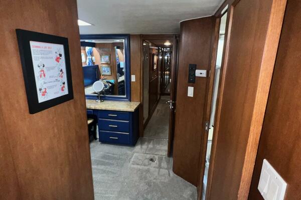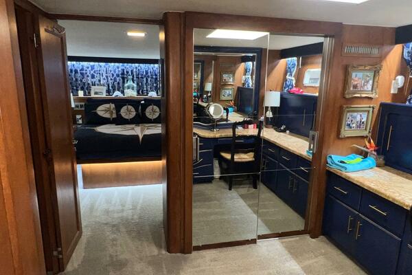 Forward in the wheelhouse, you can go down a short stairway into the accommodations. In this area, there are four full staterooms, each with its own ensuite head. The private master stateroom is all the way aft featuring a centerline, king-sized berth and a large dressing room.