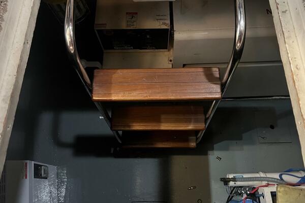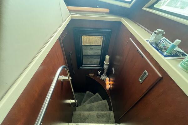 You enter the interior of the vessel through either the port or starboard sliding doors into the large wheelhouse. From this point, you can access multiple areas: There is a doorway leading aft to the galley, a stairway leading down to the accommodations and a ladder leading up to the large flybridge.
