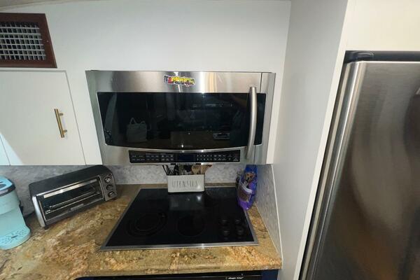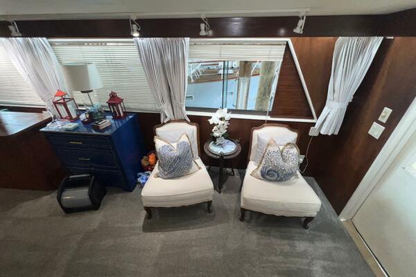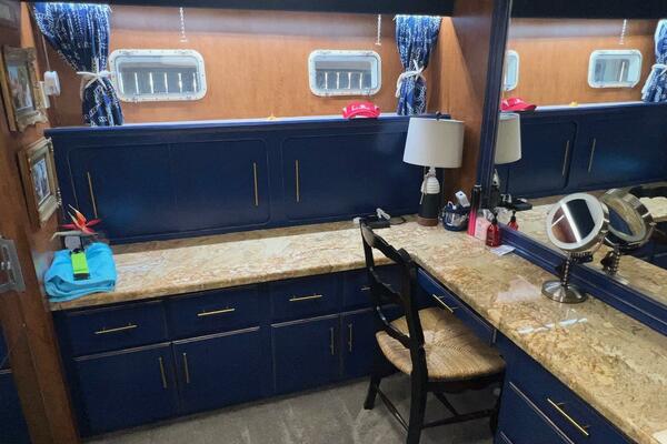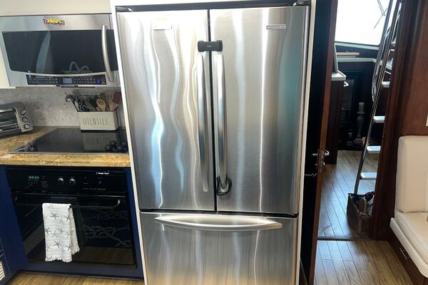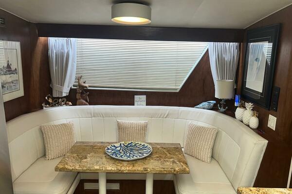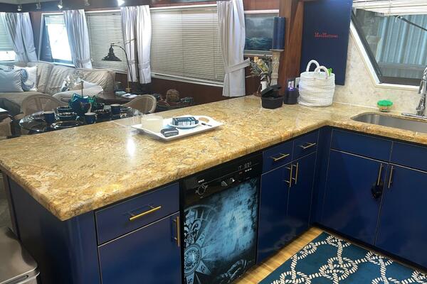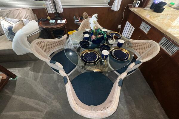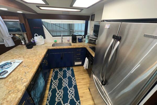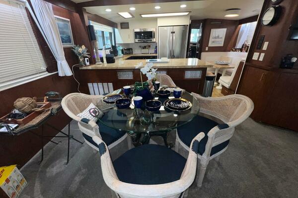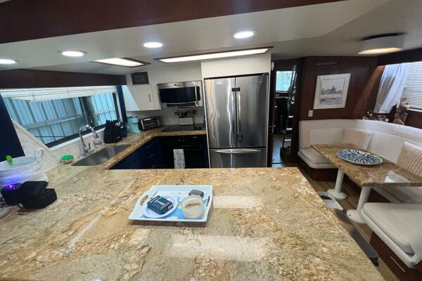 From the wheelhouse, if you move aft through the door, you will enter into the large, luxurious galley. The space takes advantage of the full beam of the boat. All the appliances are updated stainless steel. Granite countertops are complimented by recently installed backsplashes. The windows in this area open and have screens. The galley is separated from the spacious salon by a breakfast bar. A large dinette is located conveniently next to the galley where the chef can visit with family and friends while cooking a feast.