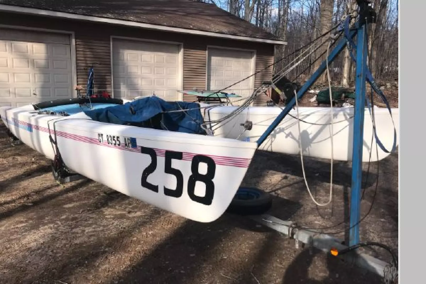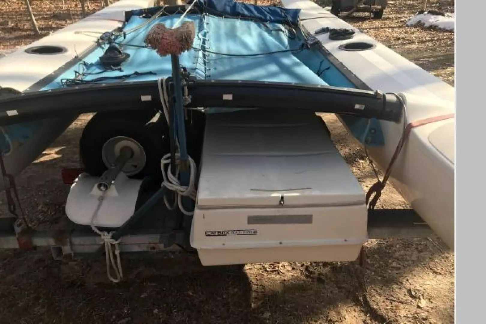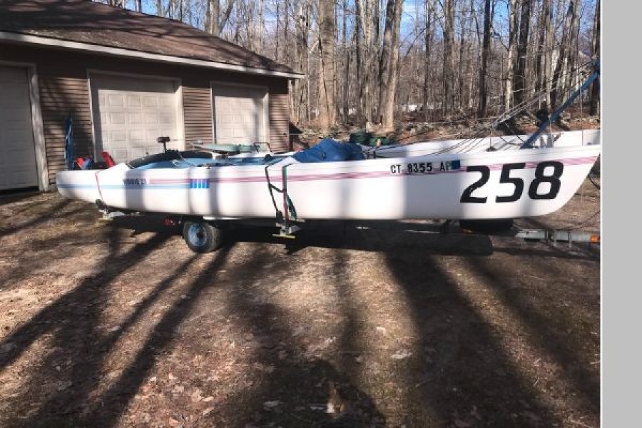 Fast fun and easy to rig. (expandable beam on both boat and galvanized Trailer) Cat Trax wheels, Cat Box for storage and custom accessories to make launching /rigging simple. Amazing speed under sail! Much faster than the 18! I have owned the 14' 16' 18' Hobies and this 21' easily outperforms all of them. Wings seats make sailing adventures more comfortable. Actual photos shown and 1 sister ship photo.