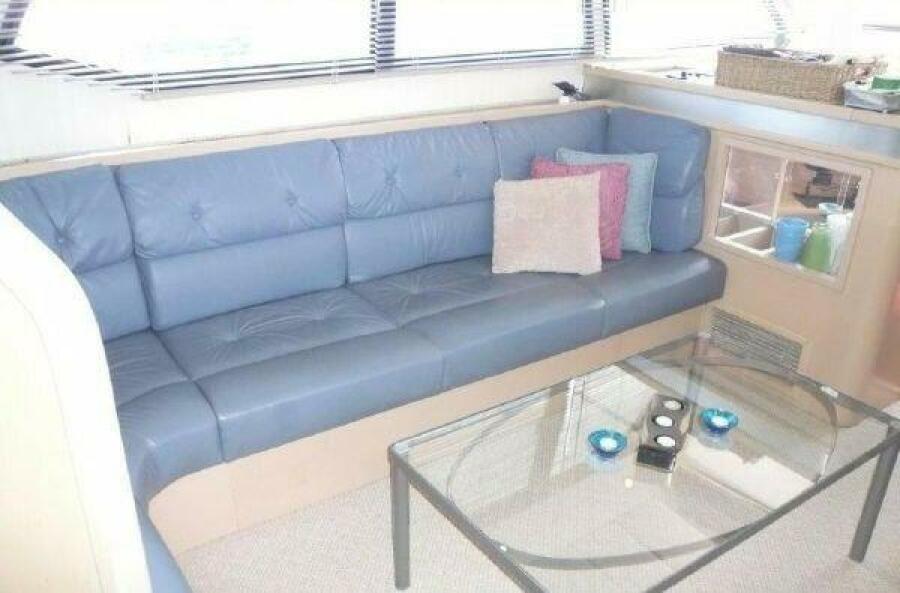 Next aft, up four stairs, is the salon. Forward to starboard is the lower steering console with captain's chair. Aft along the starboard side are built-in cabinets. Opposite to the port is a L-shaped settee. On centerline, circular stairs lead up to the aft deck area, and to starboard, stairs lead down the the master stateroom. The upright washer and dryer are located in this lower stairway area.