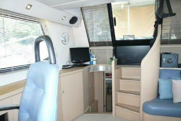 The flybridge are is quite large with captain's chair, mate's chair and a large bench seat behind. Above the bench seat is another sunning area. The instruments are especially wall installed and the visibility is excellent from the helm.