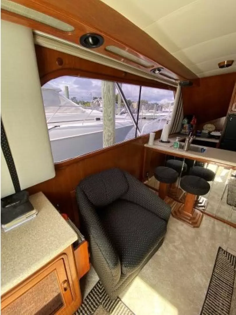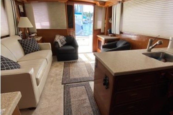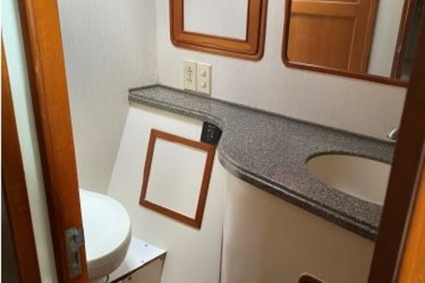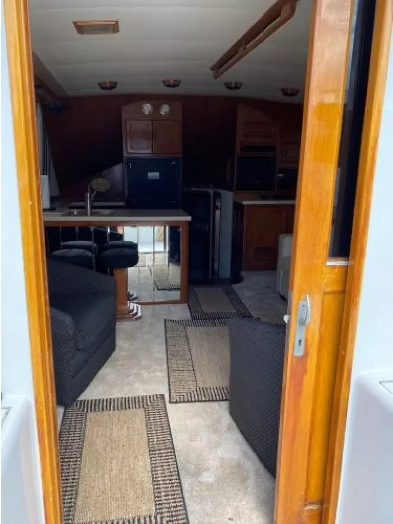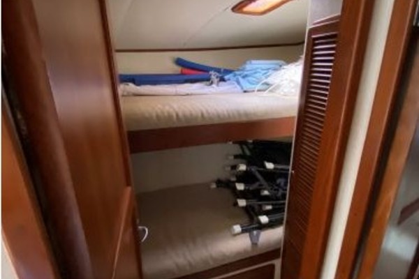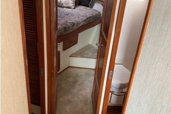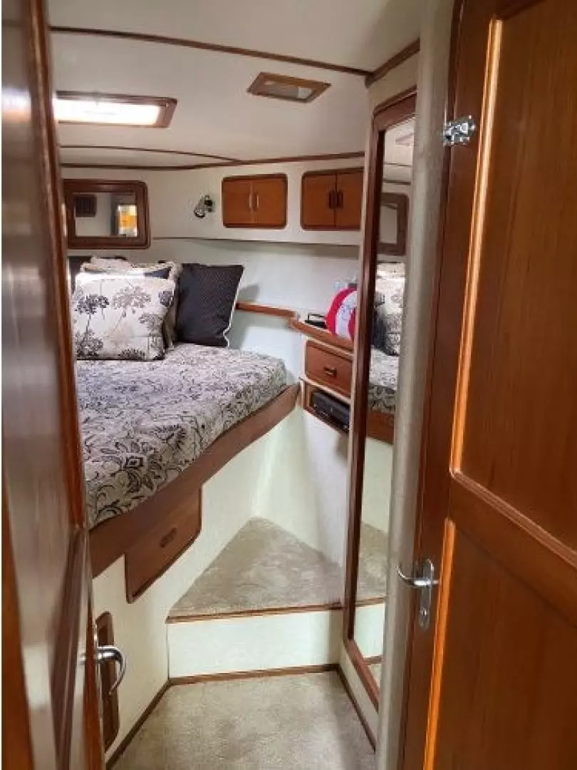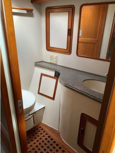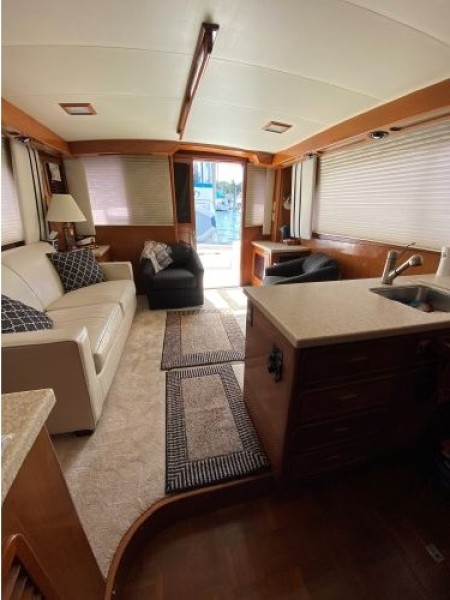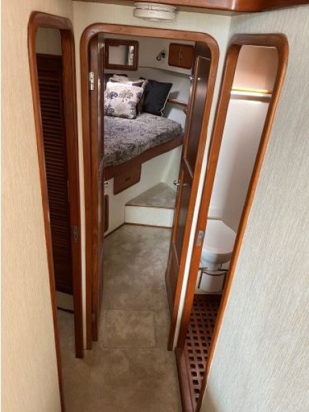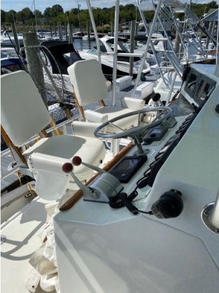 A separate stateroom has twin bunks with under bunk drawers and a hanging closet. The head and separate shower are to starboard. Rich teak trim throughout the interior with Corian counters and new carpet.