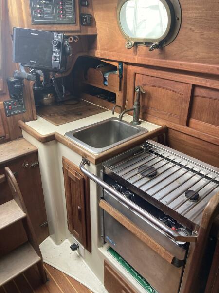 With 6' 1" headroom the Dana 24 feels like a much larger boat. Stepping down the companionway, to port is a full galley with a gimbaled Force 10 two burner propane stove with oven, a large insulated icebox, a 10" deep sink with hand pump and a fold-up extension to the counter space. To starboard is the walk-in head compartment with manual head, a sink with hand pump, an integral shower pan and a hanging wet locker.