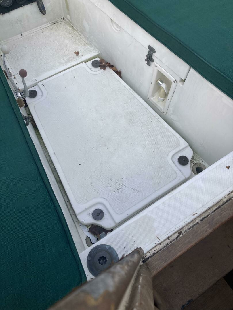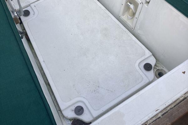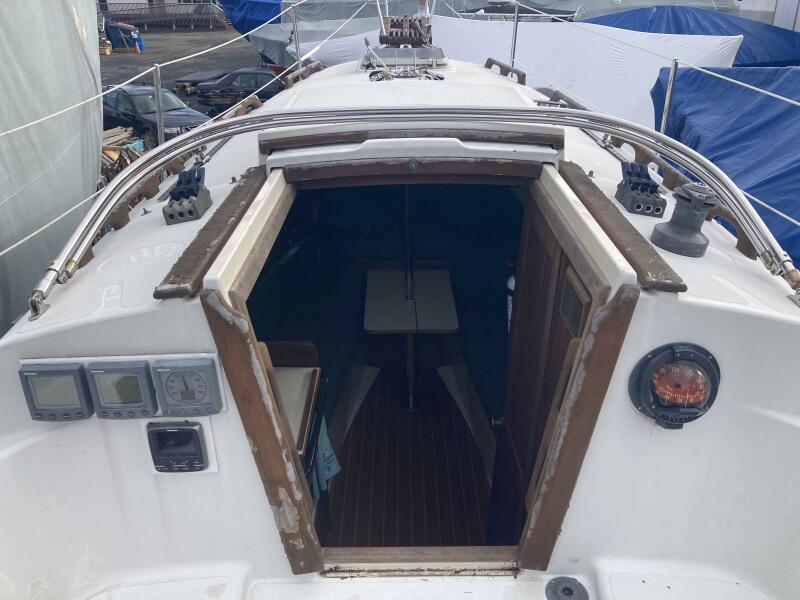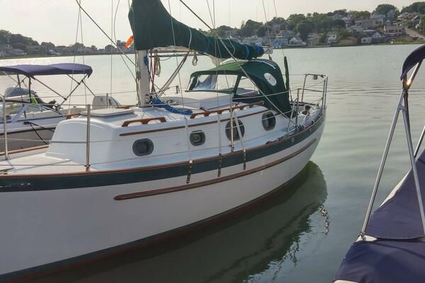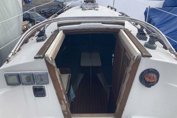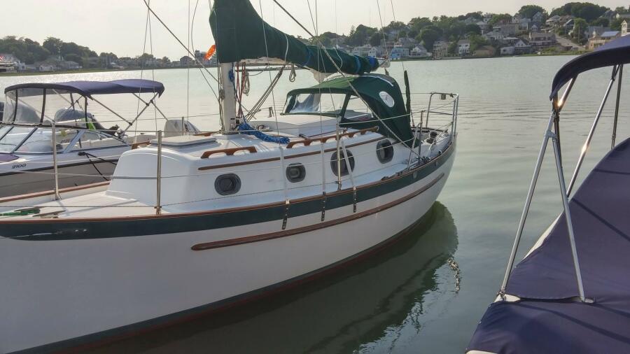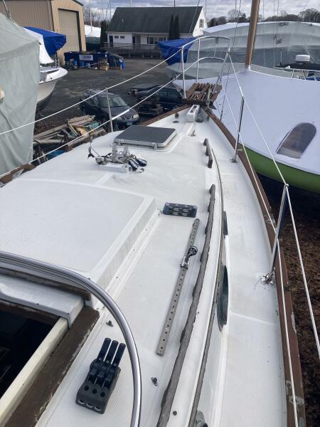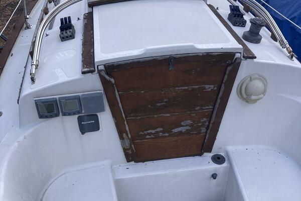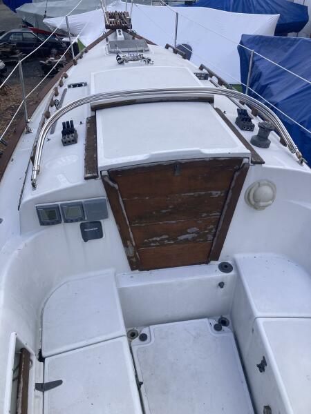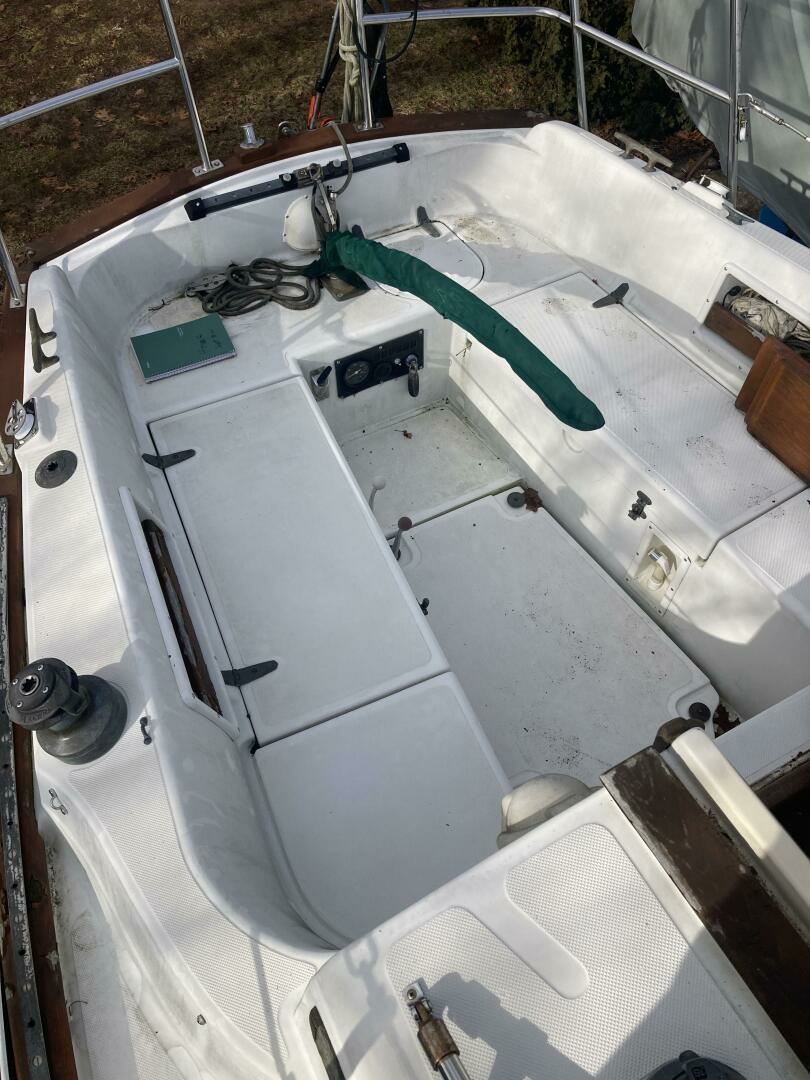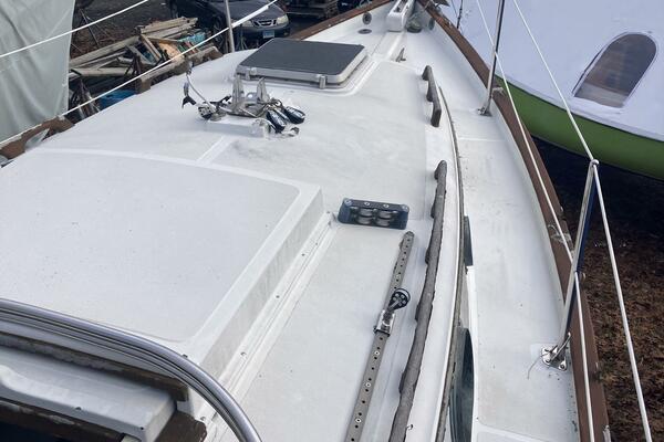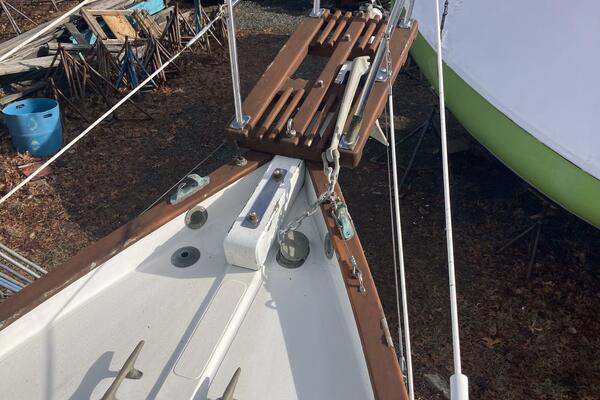 A cutter rig with 3' teak bowsprit with anchor roller, plow type anchor chain and nylon rode. Stainless steel bow and stern rails with stanchions and lifelines. Bronze cleats, chocks and opening ports. Large Bomar deck hatch. The cockpit with tiller steering can accommodate up to six adults. The cockpit bench seats are 6'3" long and 18" wide with storage below. There is a green dodger with matching cockpit cushions. A removable deck hatch in the cockpit floor provided good engine room access.