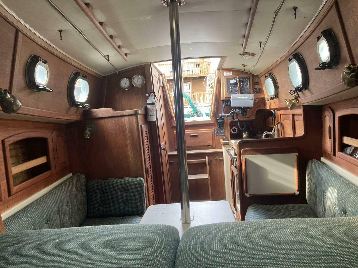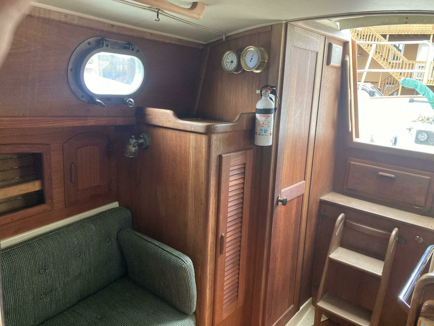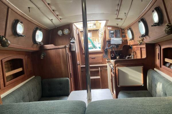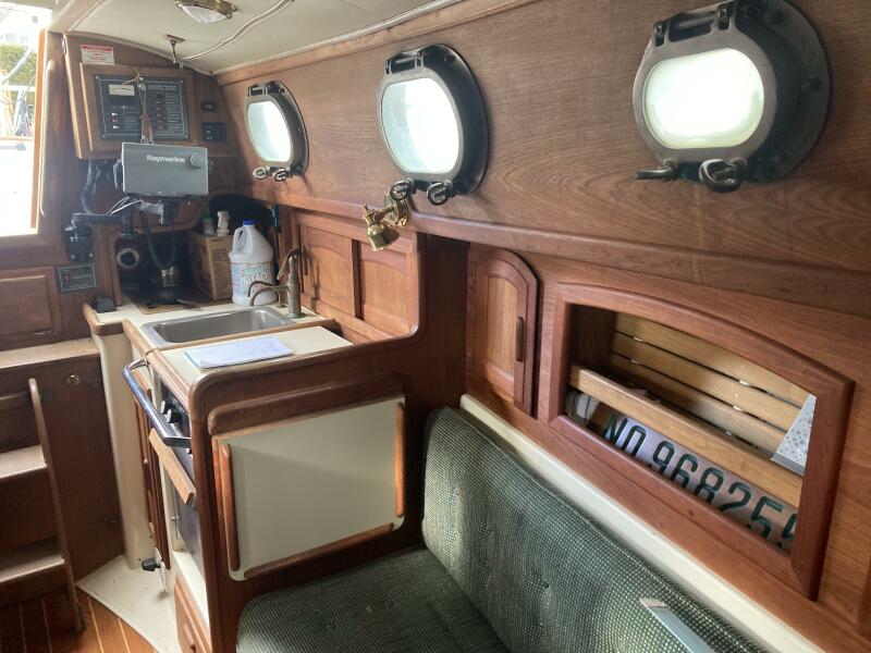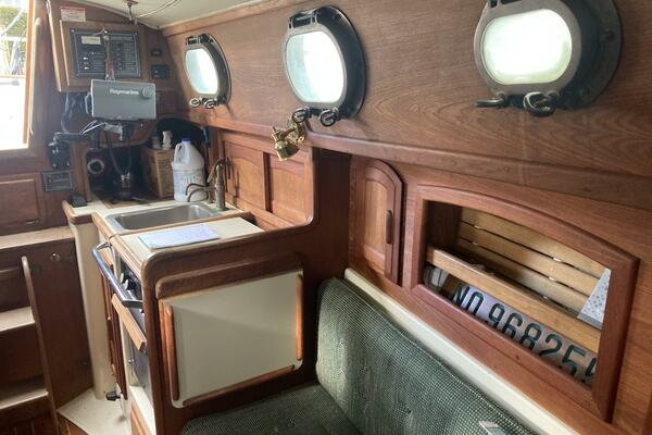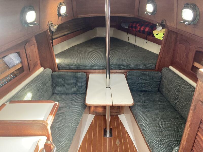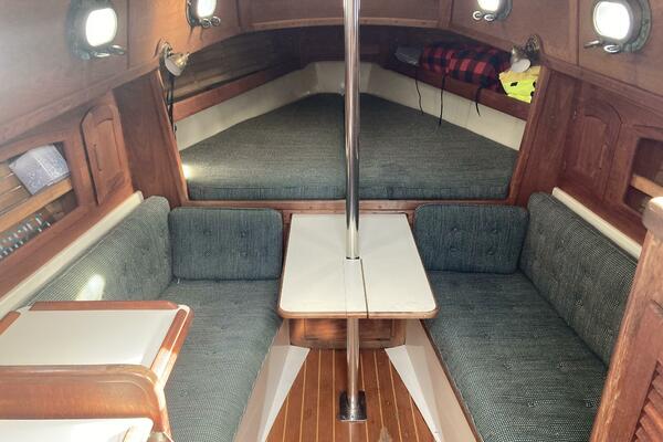 Four people can sleep comfortably with two 6' 6" settees and a forward V-berth that is 6' 8" long and 6' 9" wide. There is additional storage in two large drawers and a drop locker beneath the berth, cabin shelving and a hanging locker. A clever dining table slides out from beneath the V berth when needed. The interior exudes the warmth of had rubbed oiled teak with teak joinery and cabinets above a teak and holly sole. Eight bronze opening ports and a large Bomar deck hatch provide good light and ventilation.
