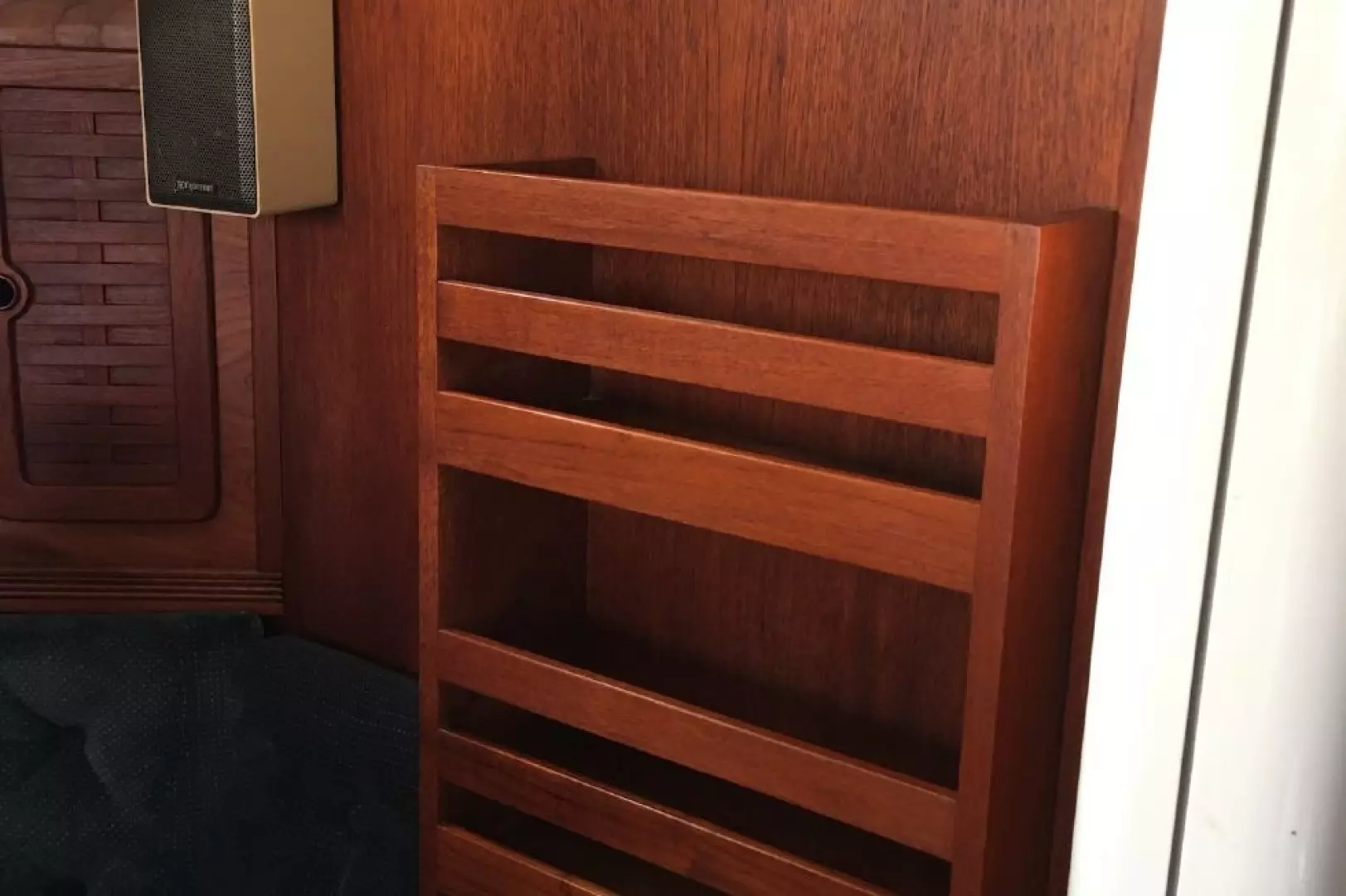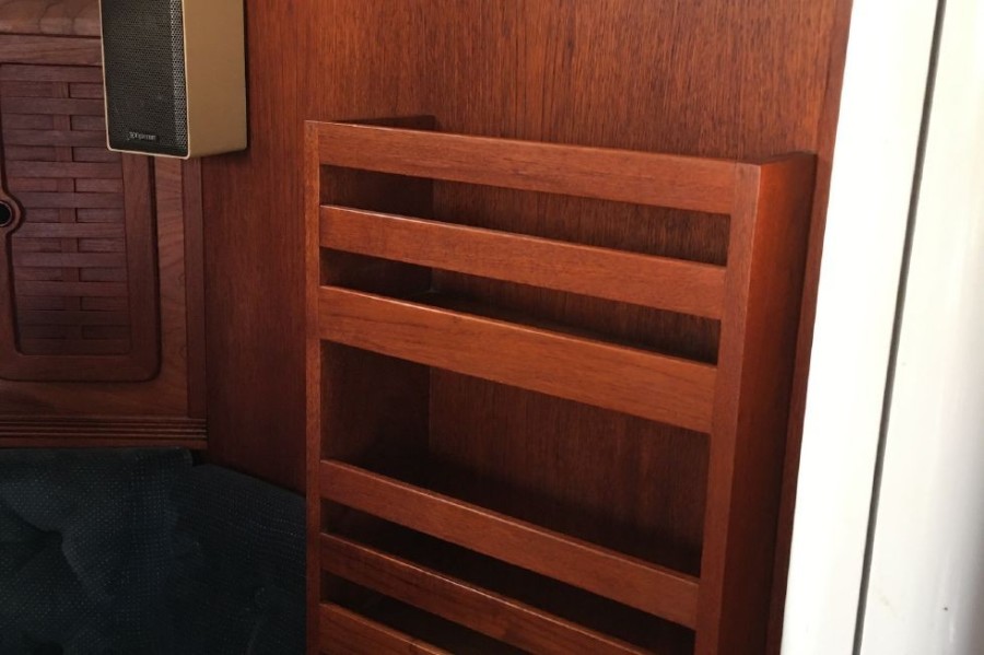 She has an aft facing Navigation station (excellent for communication with the cockpit and just aft of the stb settee). It is both comfortable and attractive, if offers a terrific amount of ready storage for navigation aids, from charts to pencils, plus a generous chart table. The Master AC/DC marine circuit breakers and optional electronics are mounted on black panels above.