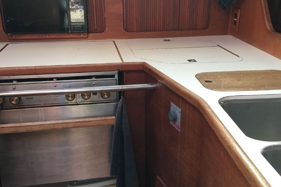 - The Sabre's L-shaped galley offers a wonderful amount of space with generous storage and counter space, it has everything needed to prepare an elegant meal. The galley is located aft of the port settee, just forward of the aft cabin.Large 4 burner CNG stove with oven