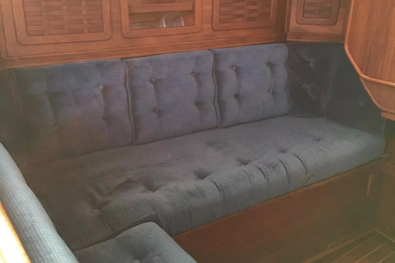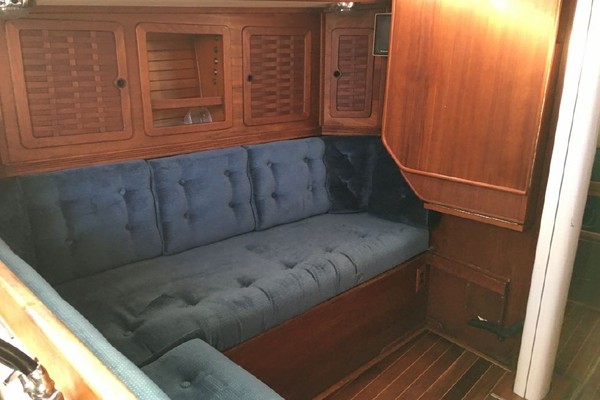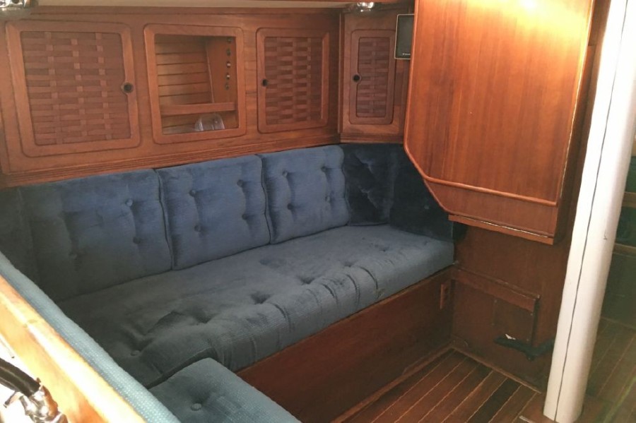 Down below, the Sabre 38 has 6'4" of headroom, two private cabins, 7 berths and a good-sized galley, head and navigation station. The forward suite has a wide V-berth, hanging closet and an elegant vanity with sink and settee. The aft cabin is another delightful retreat, with a comfortable double berth, a wide settee and hanging locker, and plenty of shelves for books or what nots. The main salon features a large dining area, with contoured seating and a handsome teak table. The table folds away ad the seats convert to a double berth to port. The starboard settee serves an another berth. The head (aft to starboard) is quite spacious and has a shower with teak grate and a vanity with sink and locker storage. Its molded fiberglass construction makes it very easy to maintain. She is finished in lovely teak cabinetry, an abundance of storage space, plenty of light and ventilation (7 hatches 4 vents and 15 ports). Her dark blue fabric lends to her warmth as well.