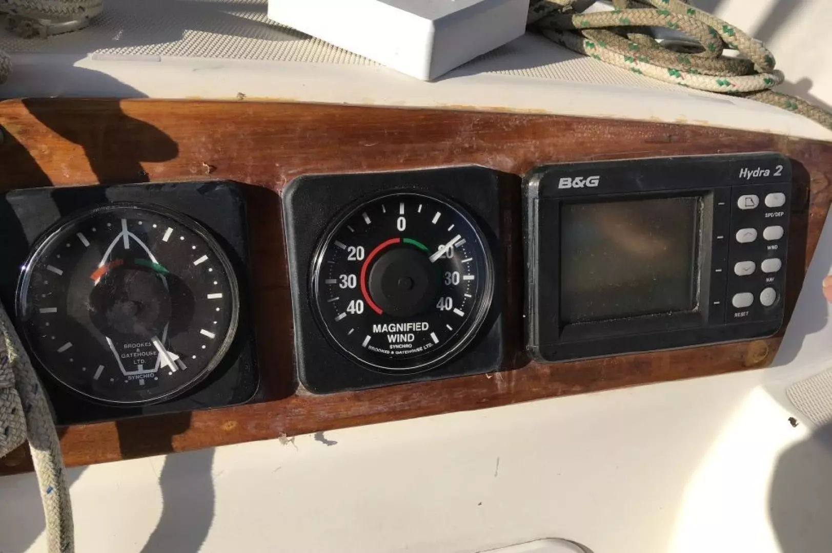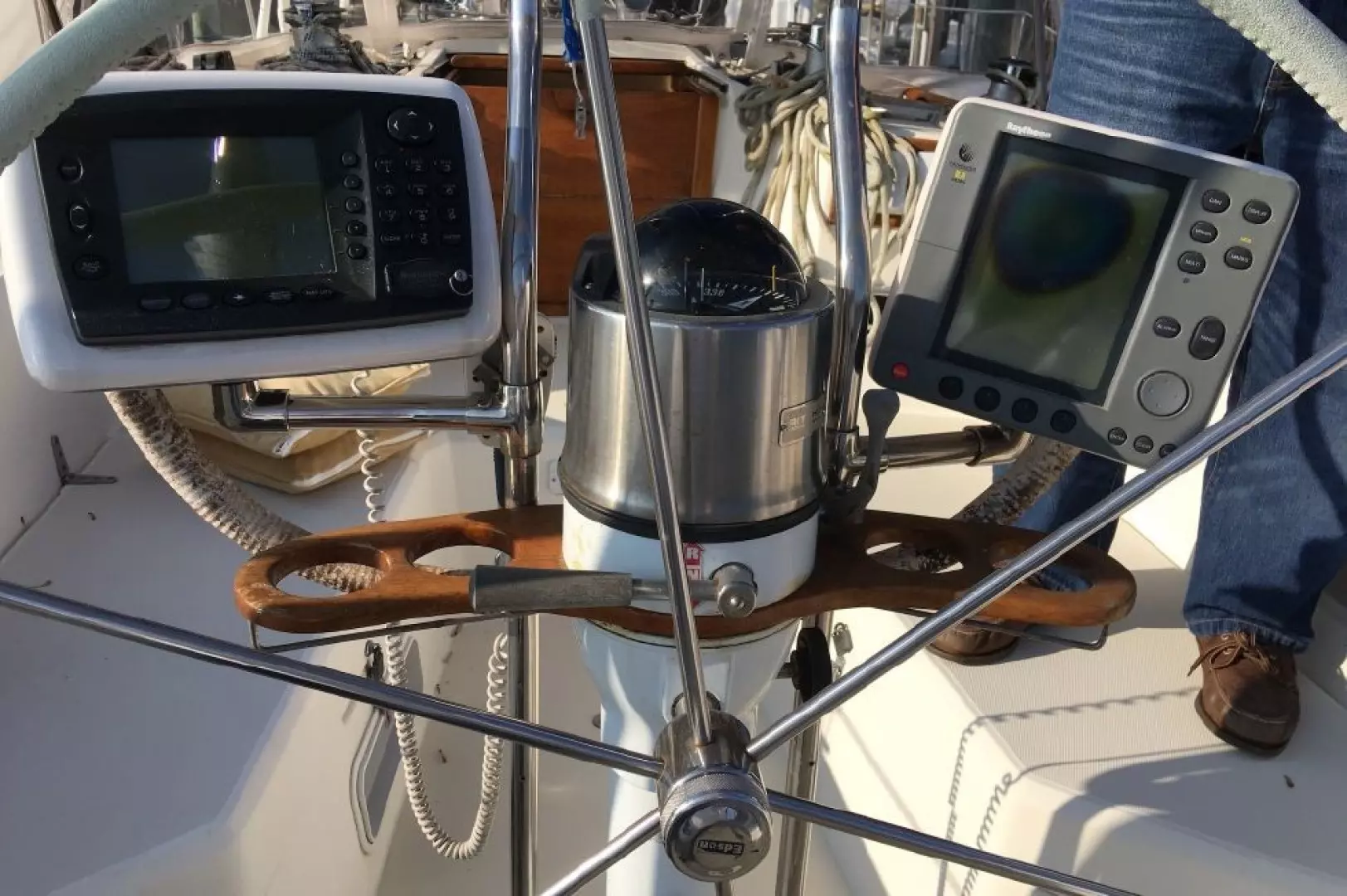 Her centerline companionway houses the engine access and leads to the cockpit. The cockpit is designed to enhance every aspect of her performance. T-shaped and 8'3" long, it's ergonomically designed for comfort and outfitted with top quality equipment. The helmsman's seat is raised to ensure good visibility, and four lockers offer plenty of storage. She has nice side decks lending to ease in going forward. Her teak toes rails, hand rails and coaming caps add to her traditional yet modern good looks.