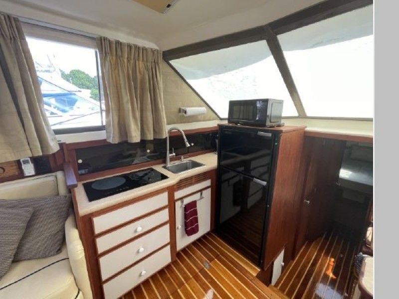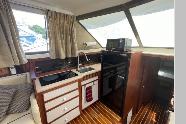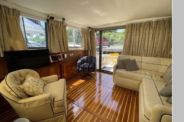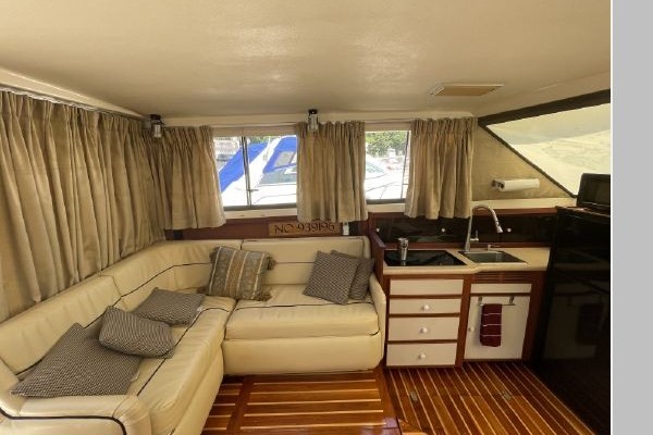 styling, comfortable accommodations, and good all-around performance. She was built on an easy-riding fiberglass hull with