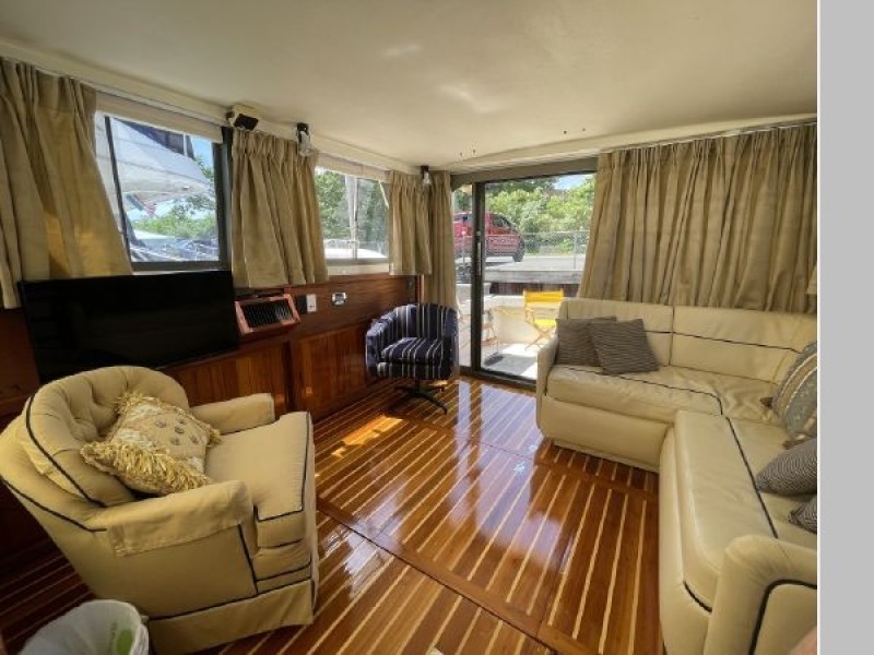 available in the Trojan 36 during her long production run with the two-stateroom layout being the more popular. All were arranged with the galley forward, a step down from the salon, and a lower helm was a popular option. For most years, teak trim and wall coverings were used throughout the interior, and large cabin windows admit plenty of natural lighting. On deck, the cockpit is big enough for some light-tackle fishing, and the tournamentstyle flybridge provides seating for up to five. A teak cockpit sole was standard through 1976—a potential source of problems that bears close examination. A variety of gas and diesel engine options were offered over the years. Among the most popular, twin 350hp Crusaders gas inboards cruise the 36 Convertible at 19 knots and deliver a top speed in the mid-to-high 20s.