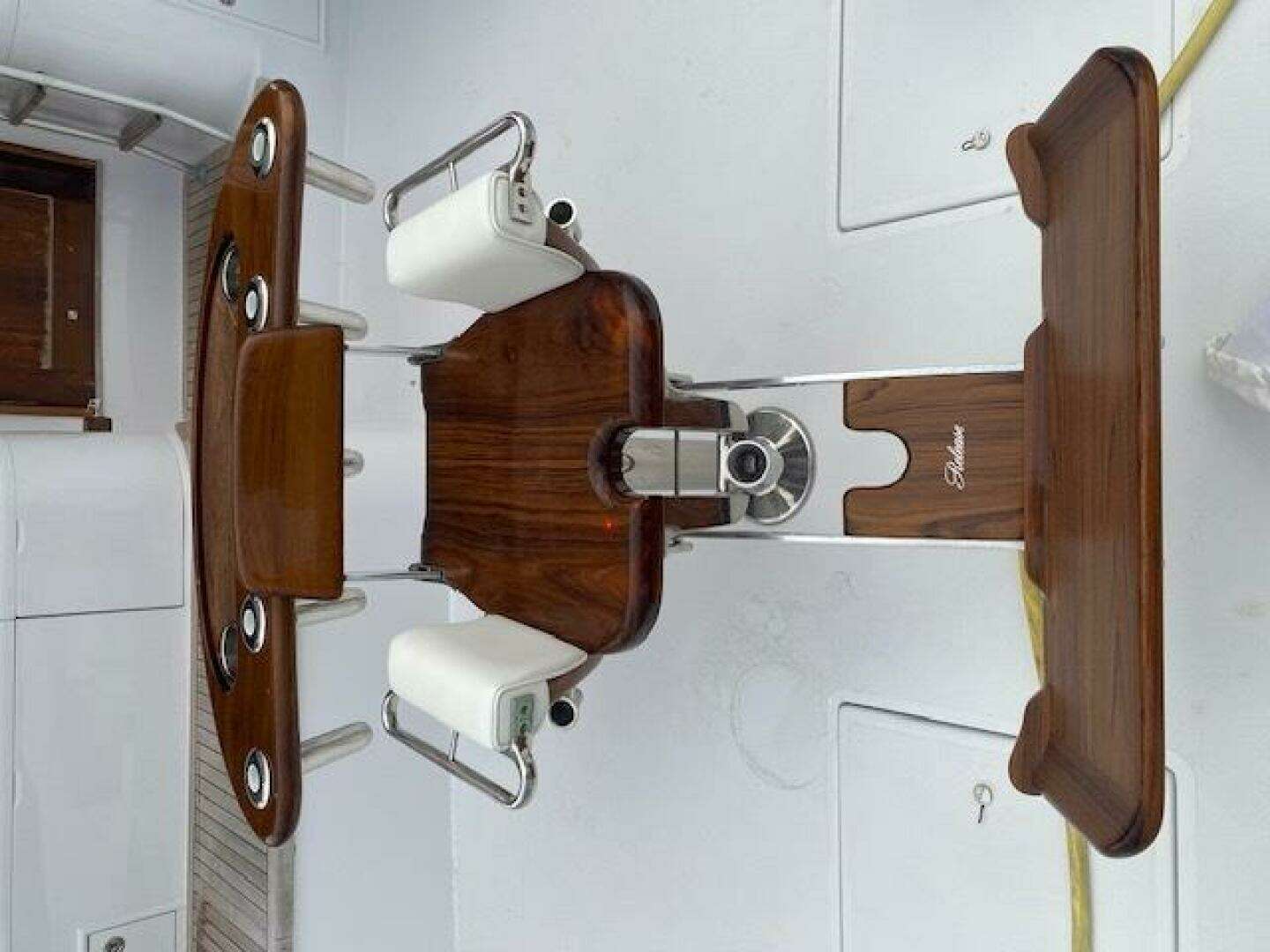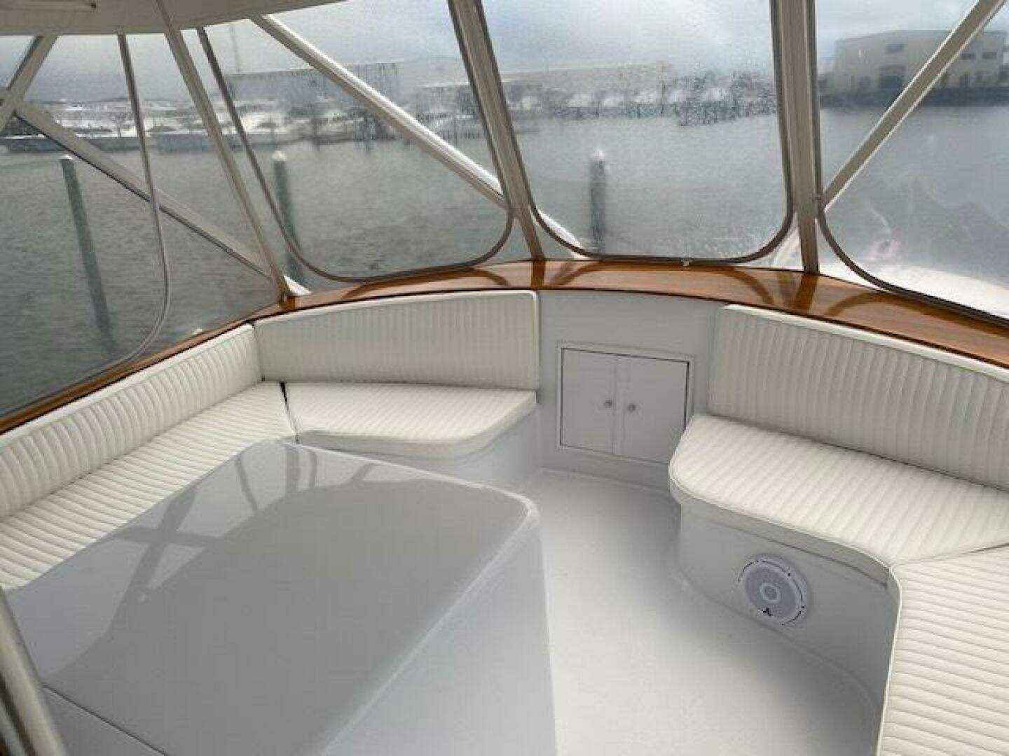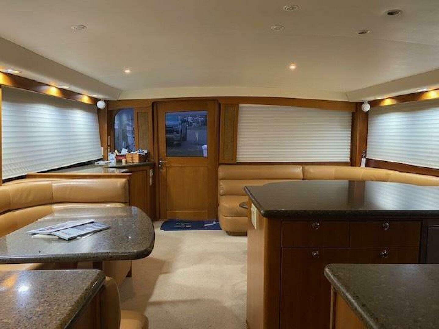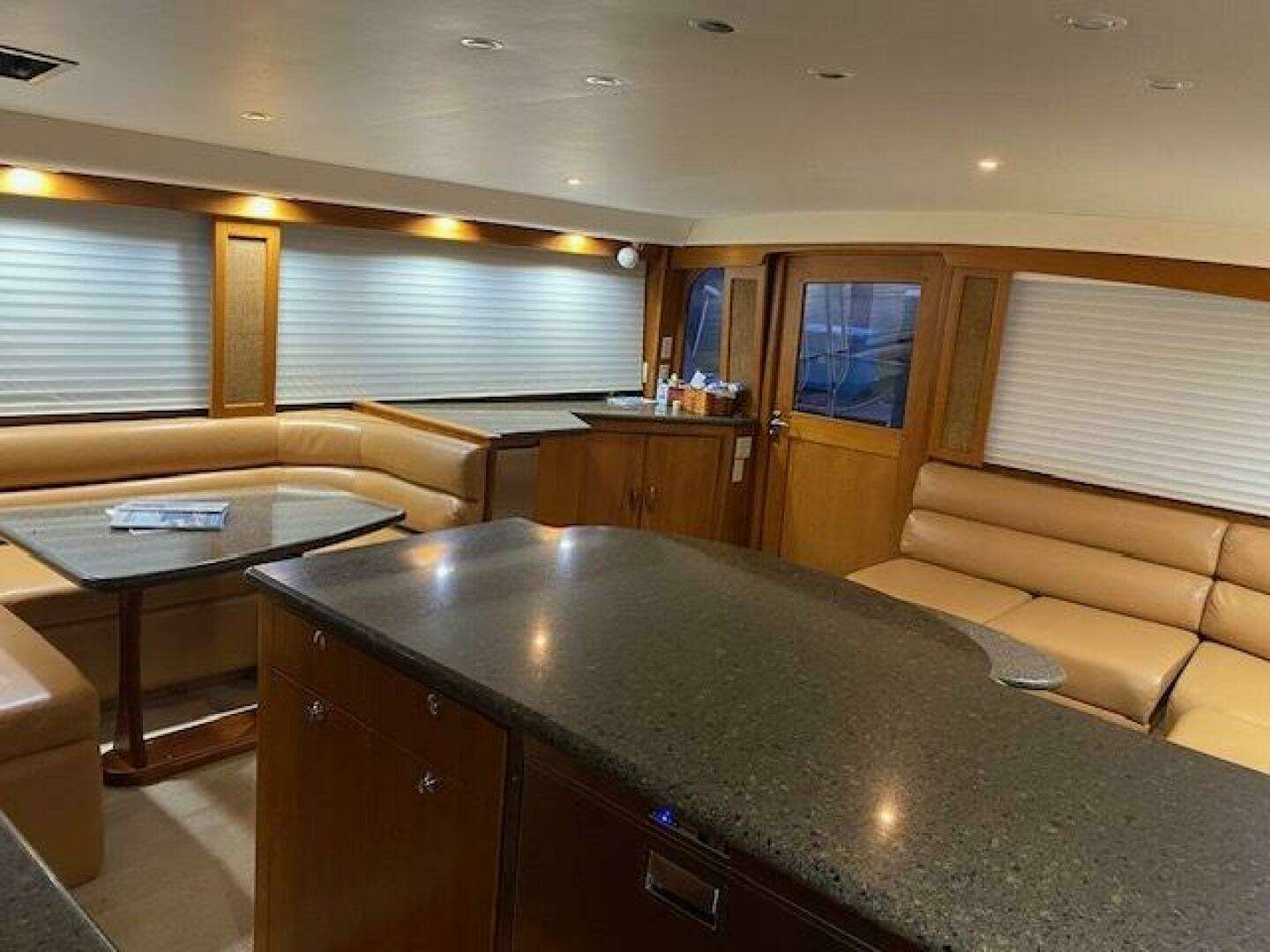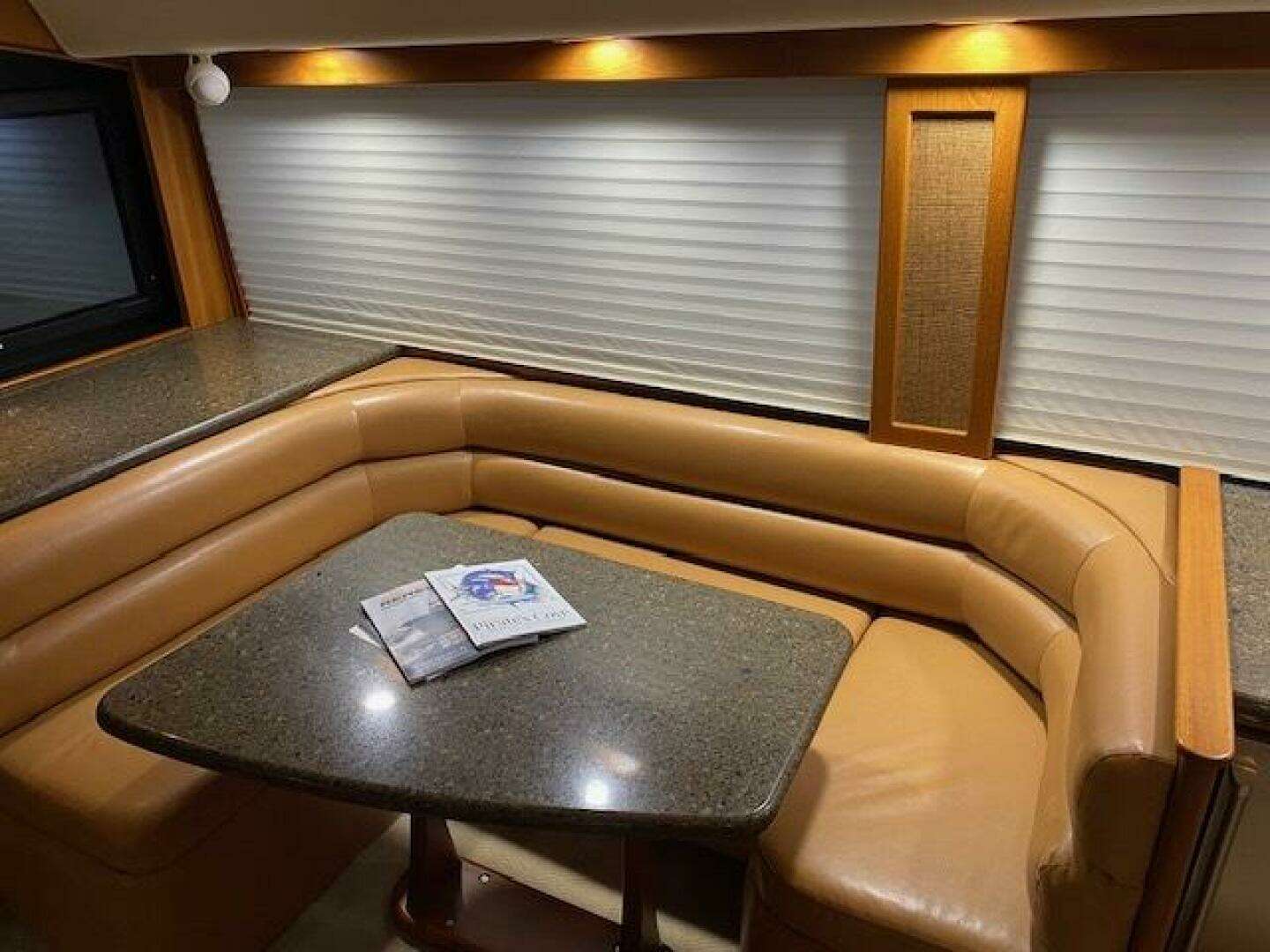 Large Silestone dinette table to Starboard with custom Van Brunt cushioned seating