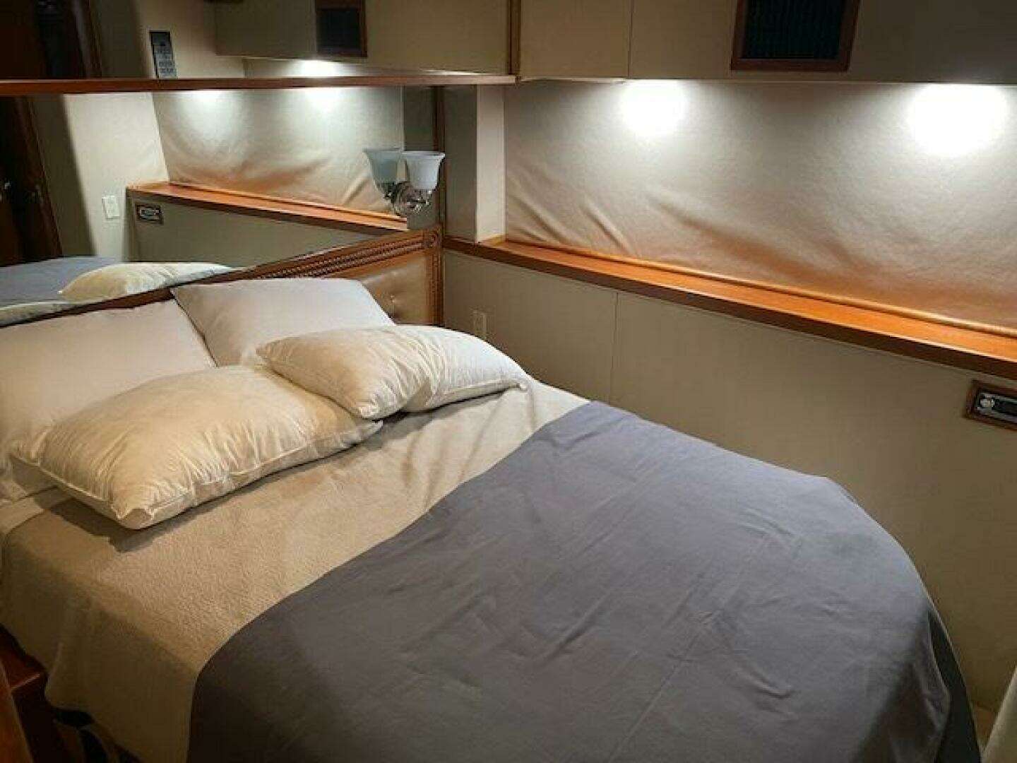 Located down the companionway forward and to starboard, these stacked bunks are roomy and comfortable, are behind a lockable door and share a full head and shower with the Crew's Quarters