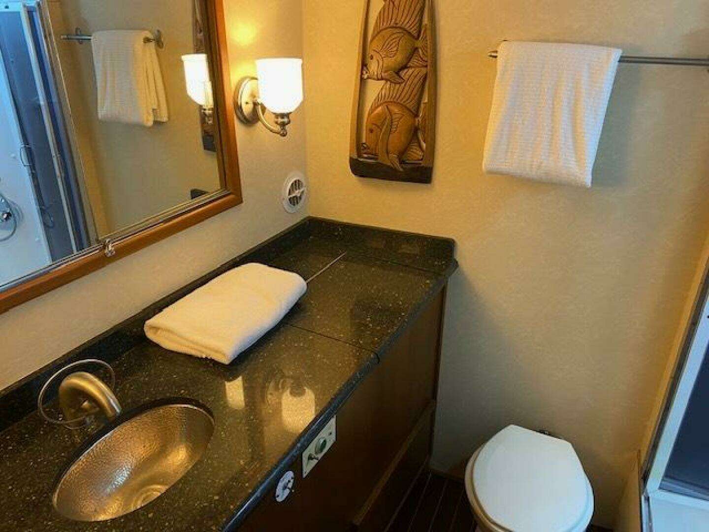 Shared head has shower, Galley Maid Toilet, Sink and Vanity, Mirrored Cabinet and Storage