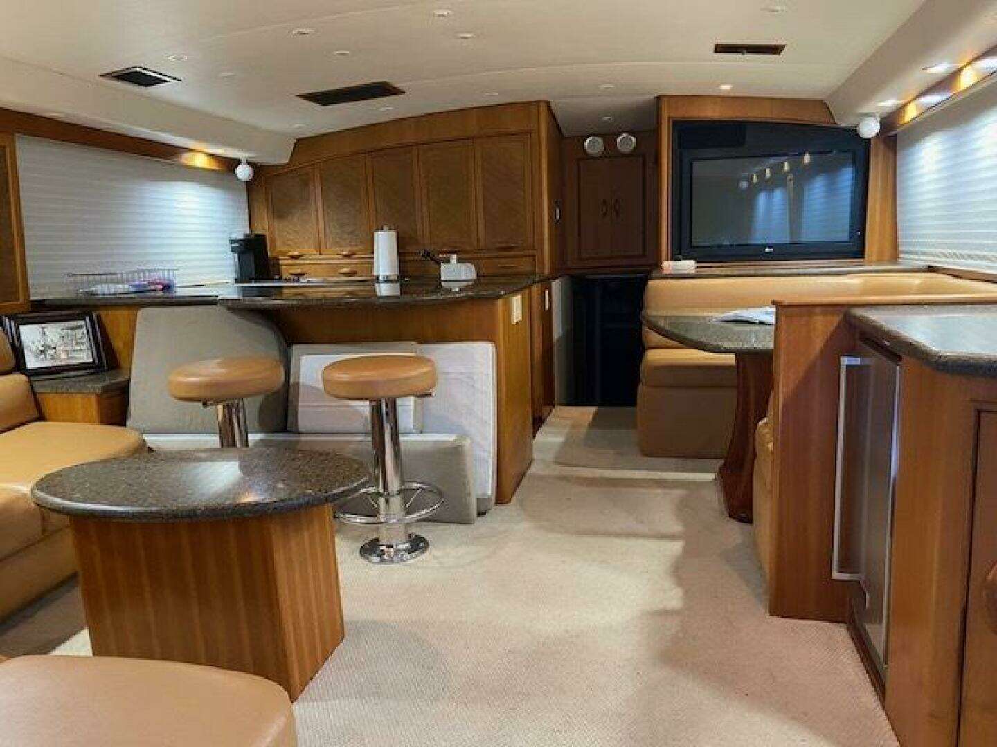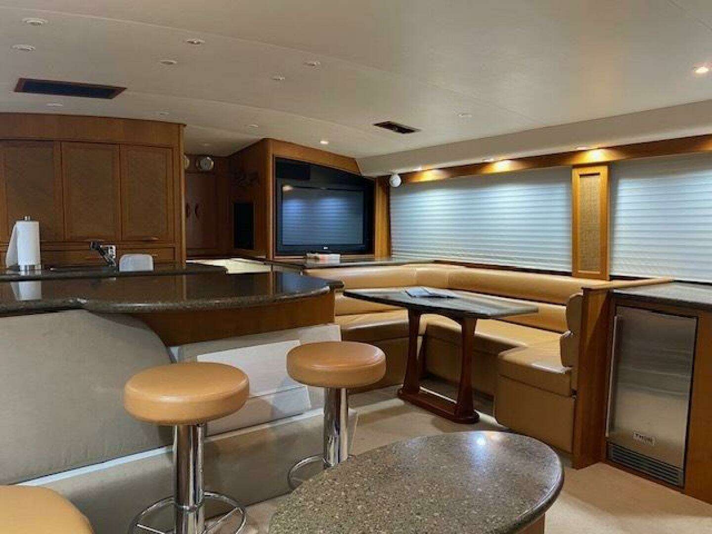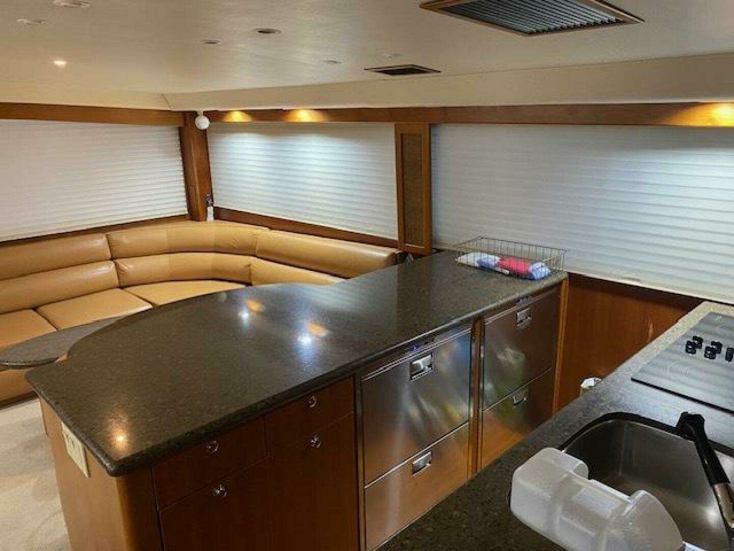 Large L-shaped custom Van Brunt hinged top couch to port. Custom upholstery with ultra leather material and easy access storage within oversized Silestone bar top with barstools and extended round table portion to port