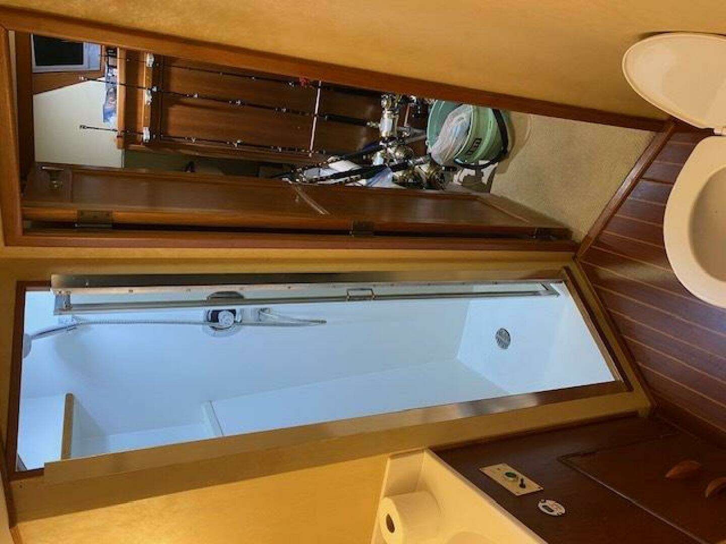 Engine room is large and spacious, with room to access the outboard sides easily, Also a dedicated pump room forward that houses AC units and other plumbing manifolds and pumps
