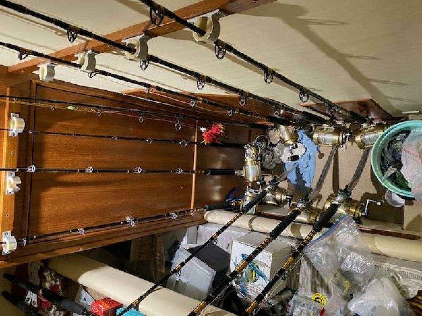 Teak roll back storage cabinetry all around and above bed