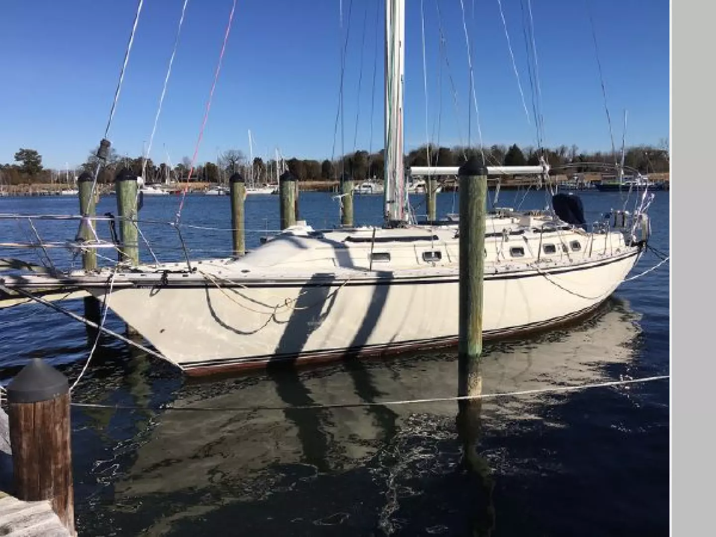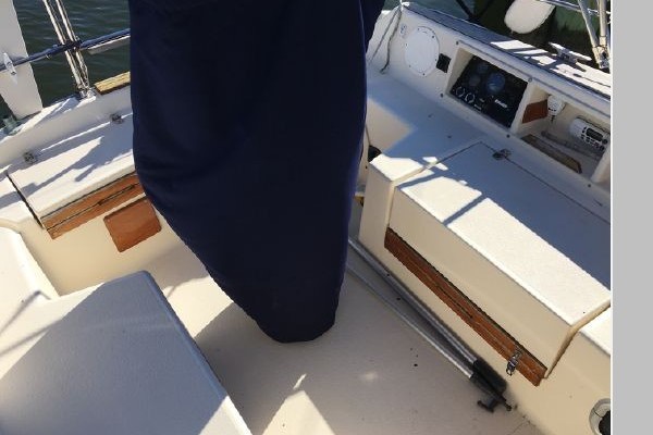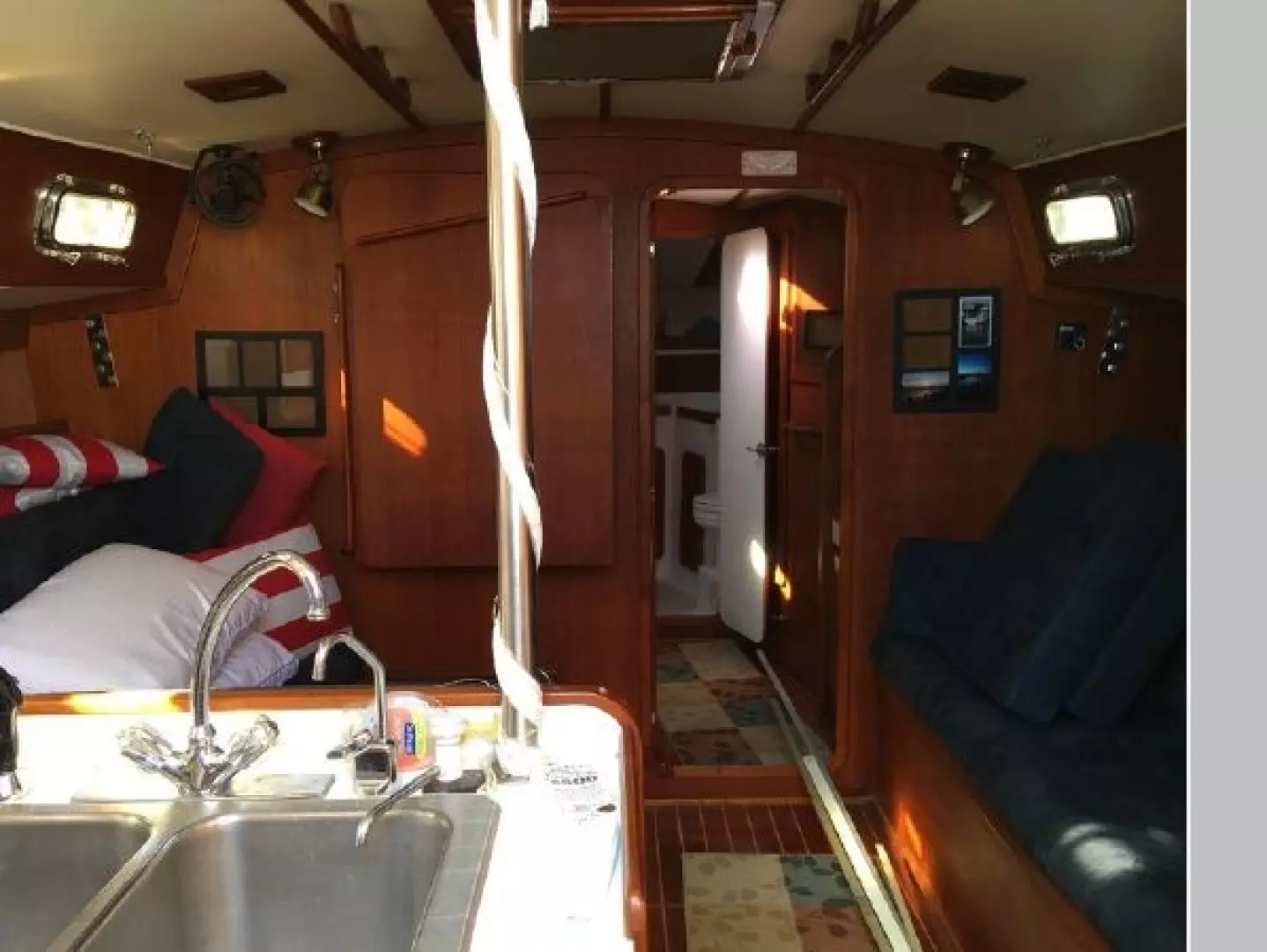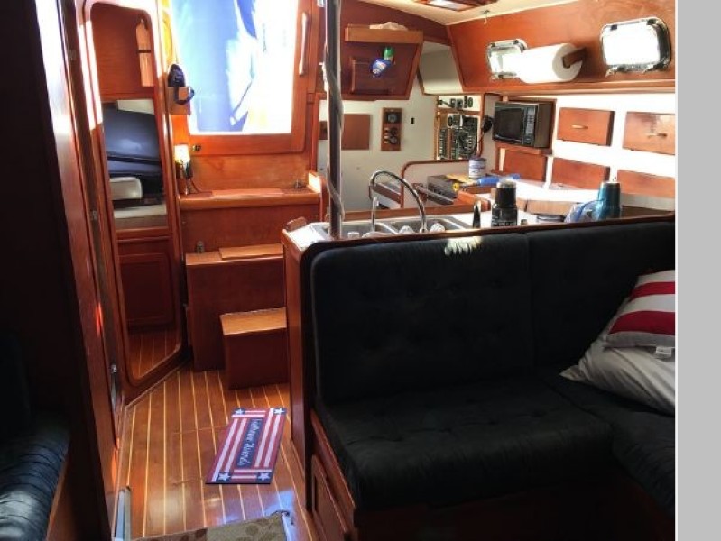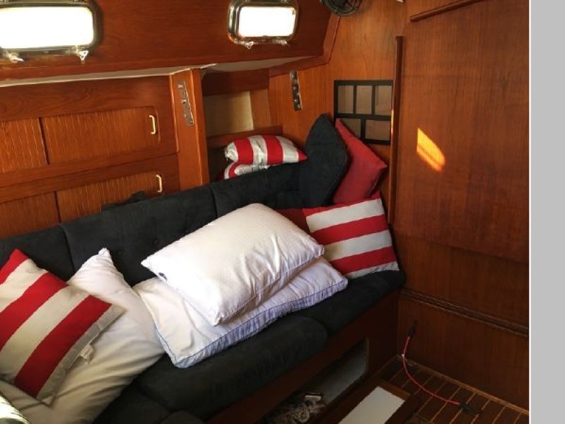 Aft of galley is the char/navt table with electrical and instrument panels. Centerline companionway with access to the engine. Lovely Ultra-suede dark blue cushions, lovely teak joinery throughout offer a warm and inviting interior. Teak and holly cabin sole, stainless steel opening ports throughout and large hatches for excellent ventilation and light.
