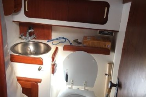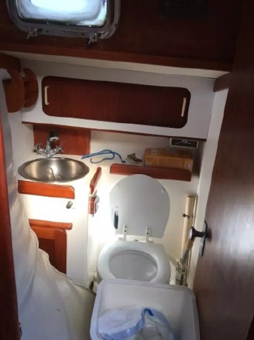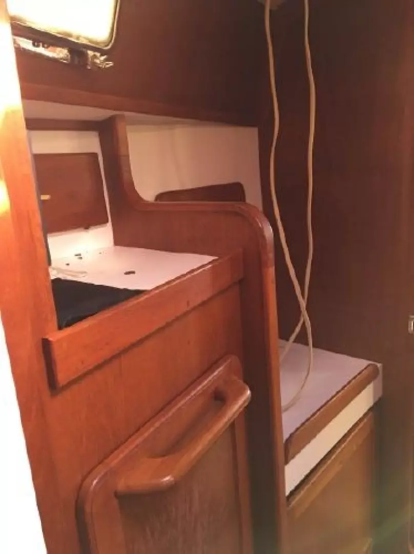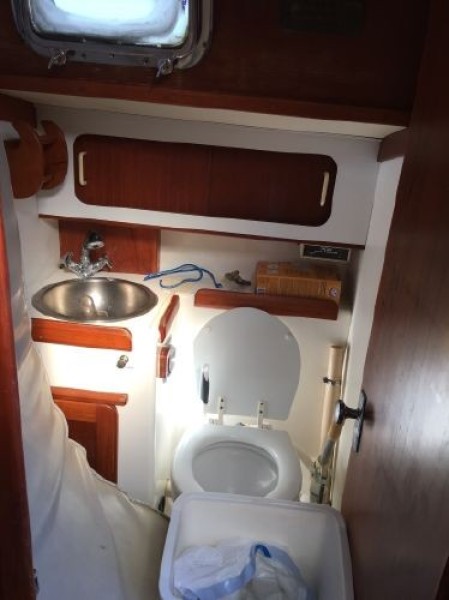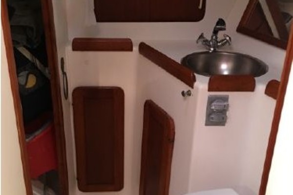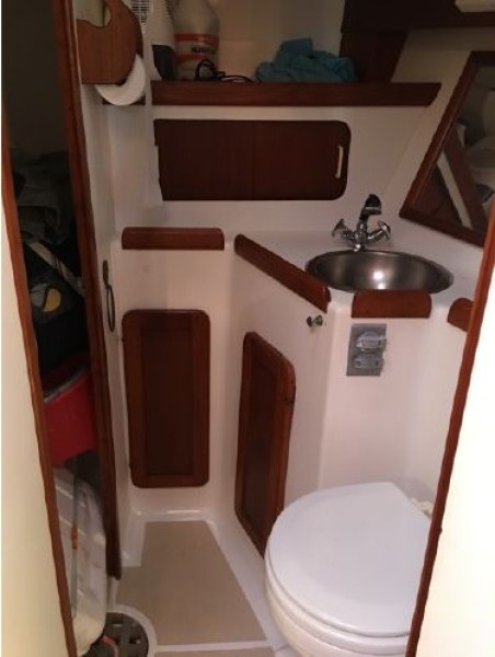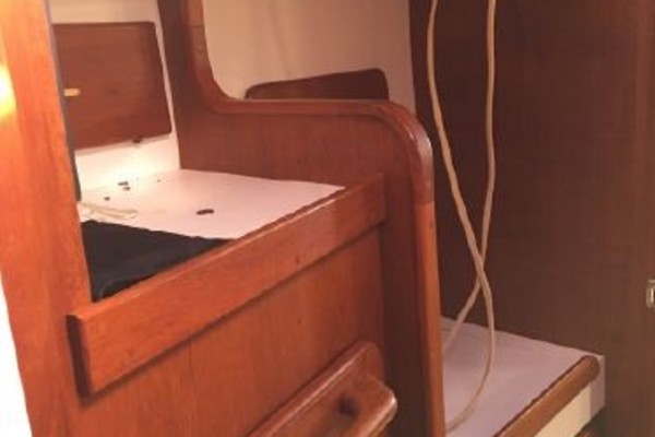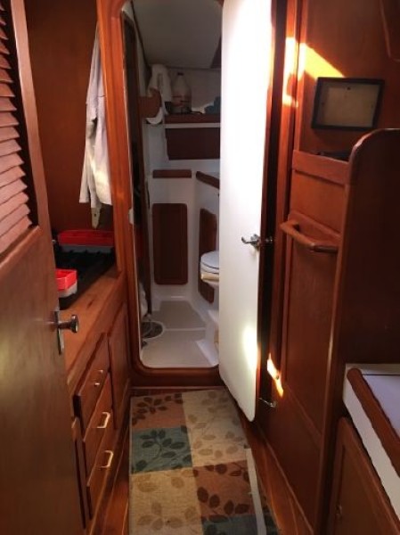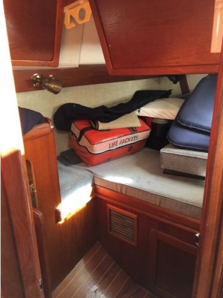 The Owner's stateroom has a pullman bunk to port, sit down vanity and a double cedar locker. A large hatch and opening ports provide excellent ventilation.