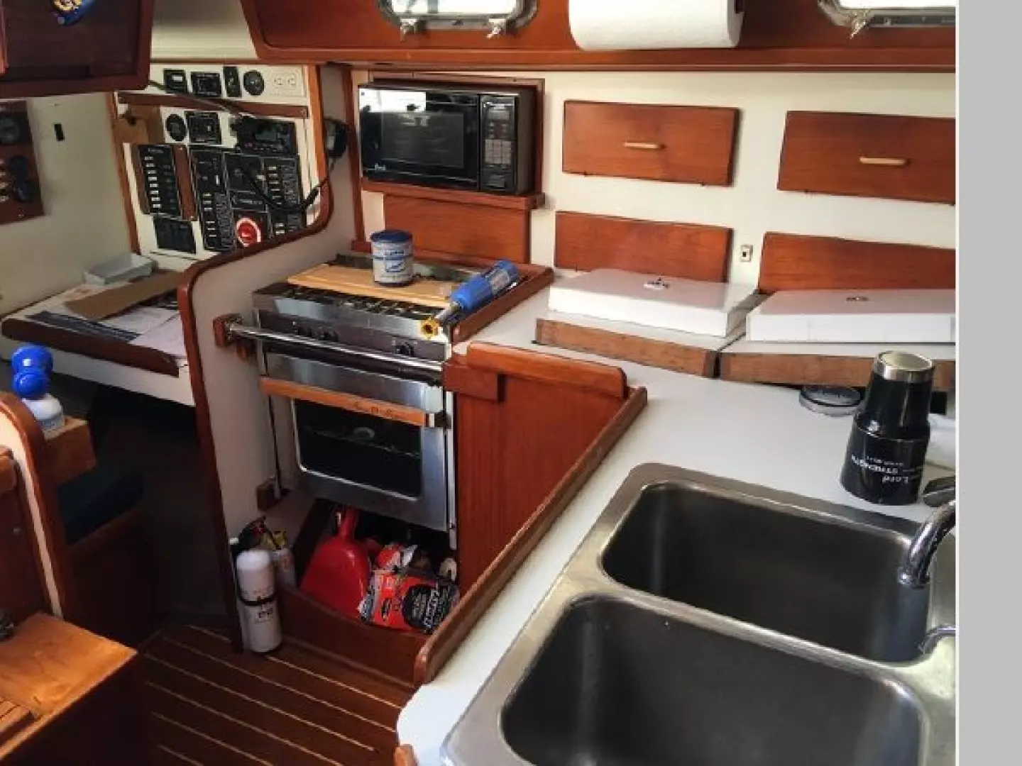 The galley is to port of the companionway and is L-shaped. There is plenty of storage and it is a safe place to work.