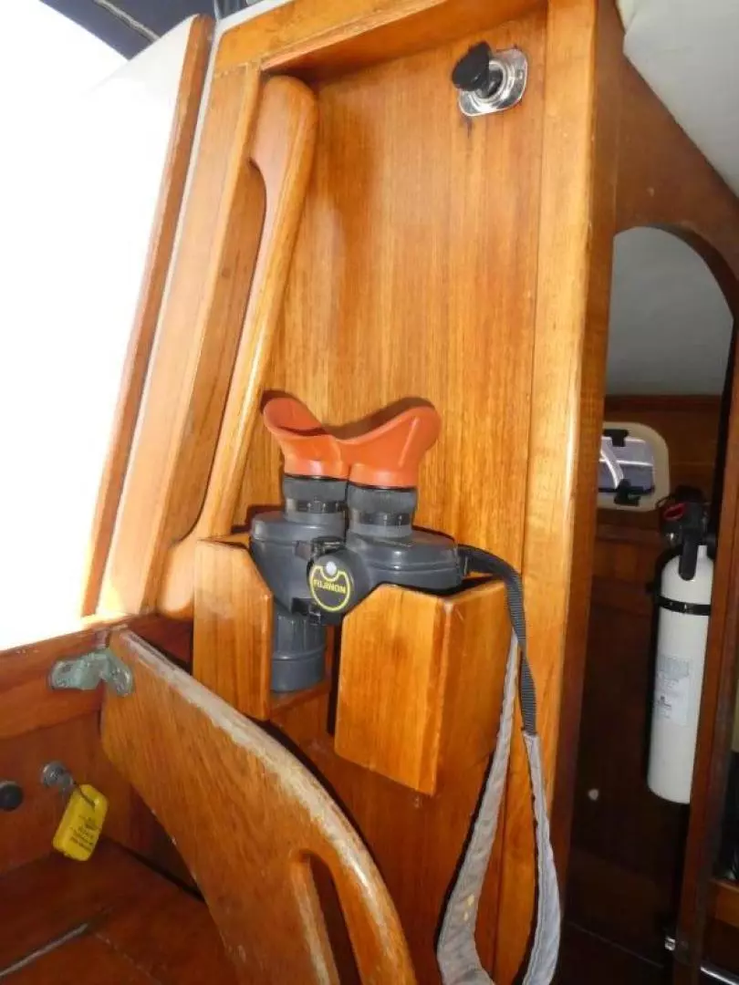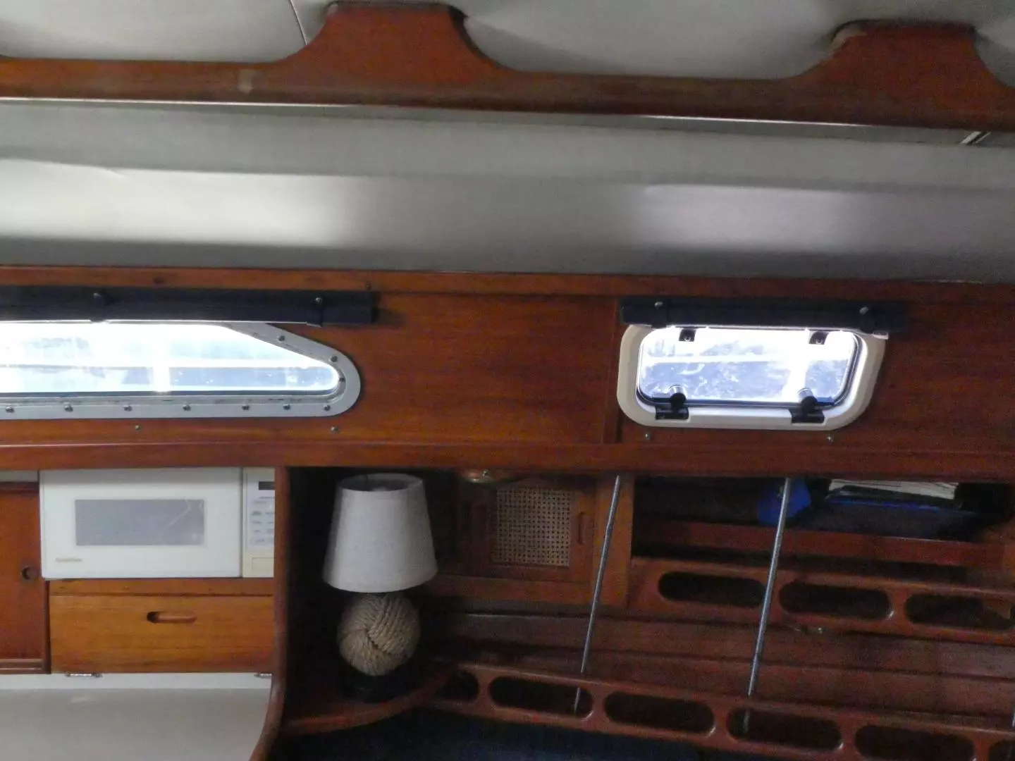 Opposite the galley, to st'brd is the navigation space, with a good sized chart table, switches and circuit breakers which are easily reached, and sufficient storage in the way of drawers and pigeon holes for charts.