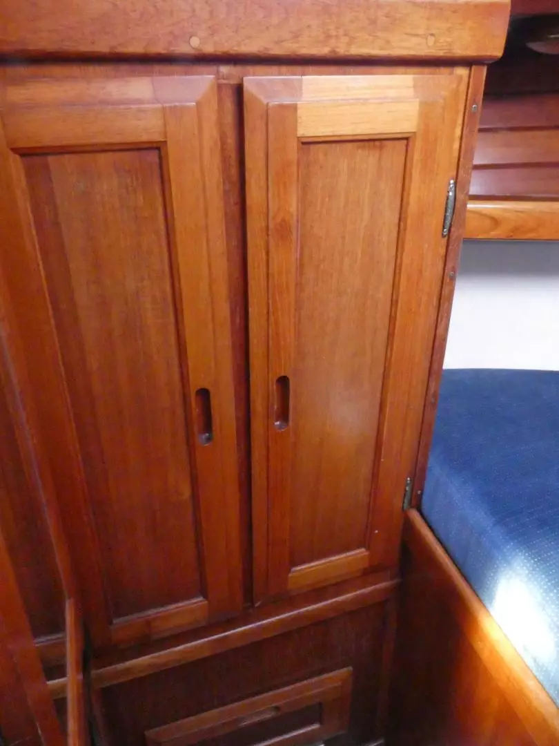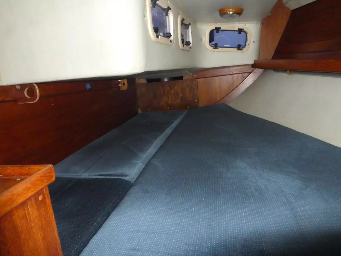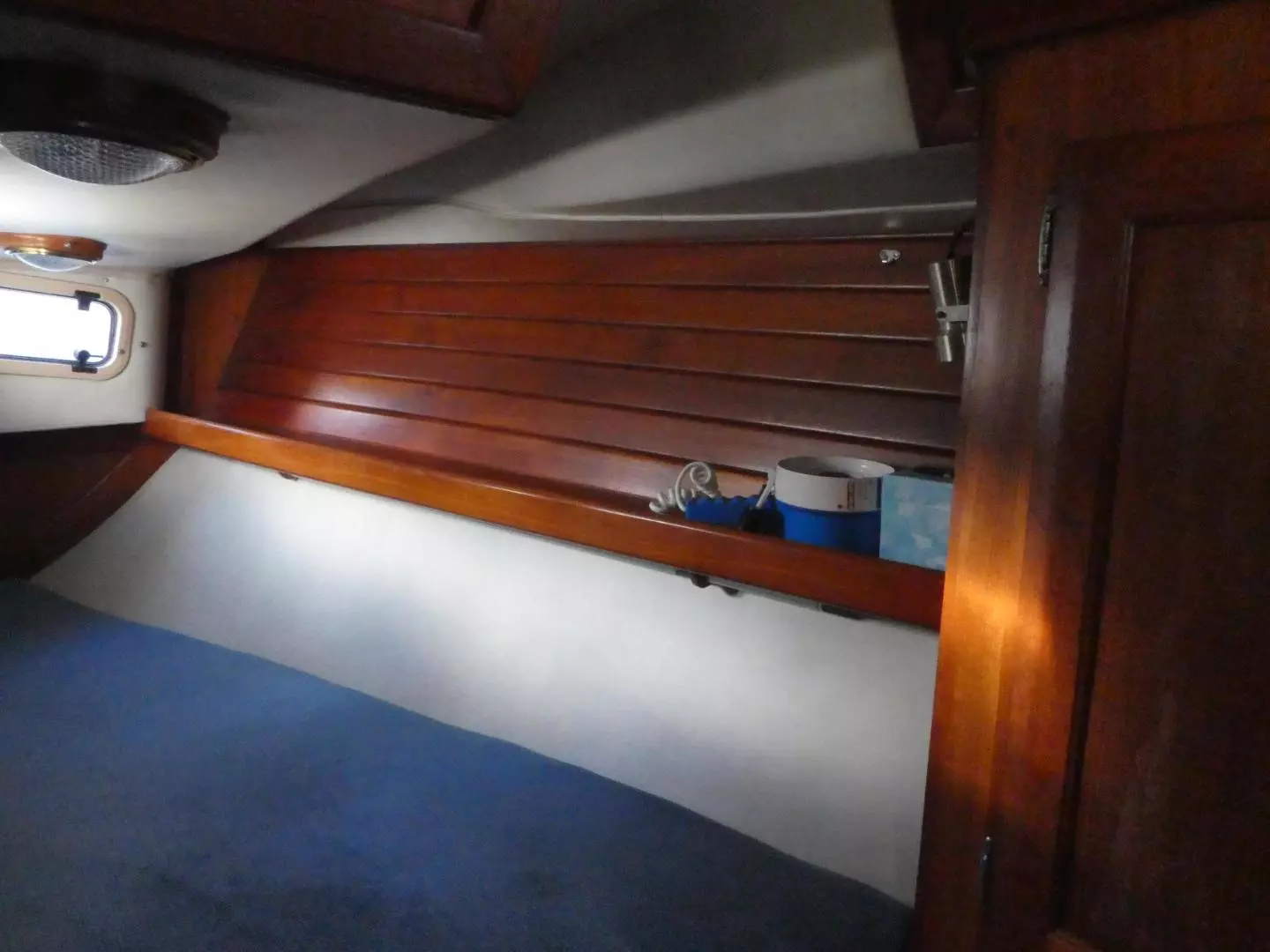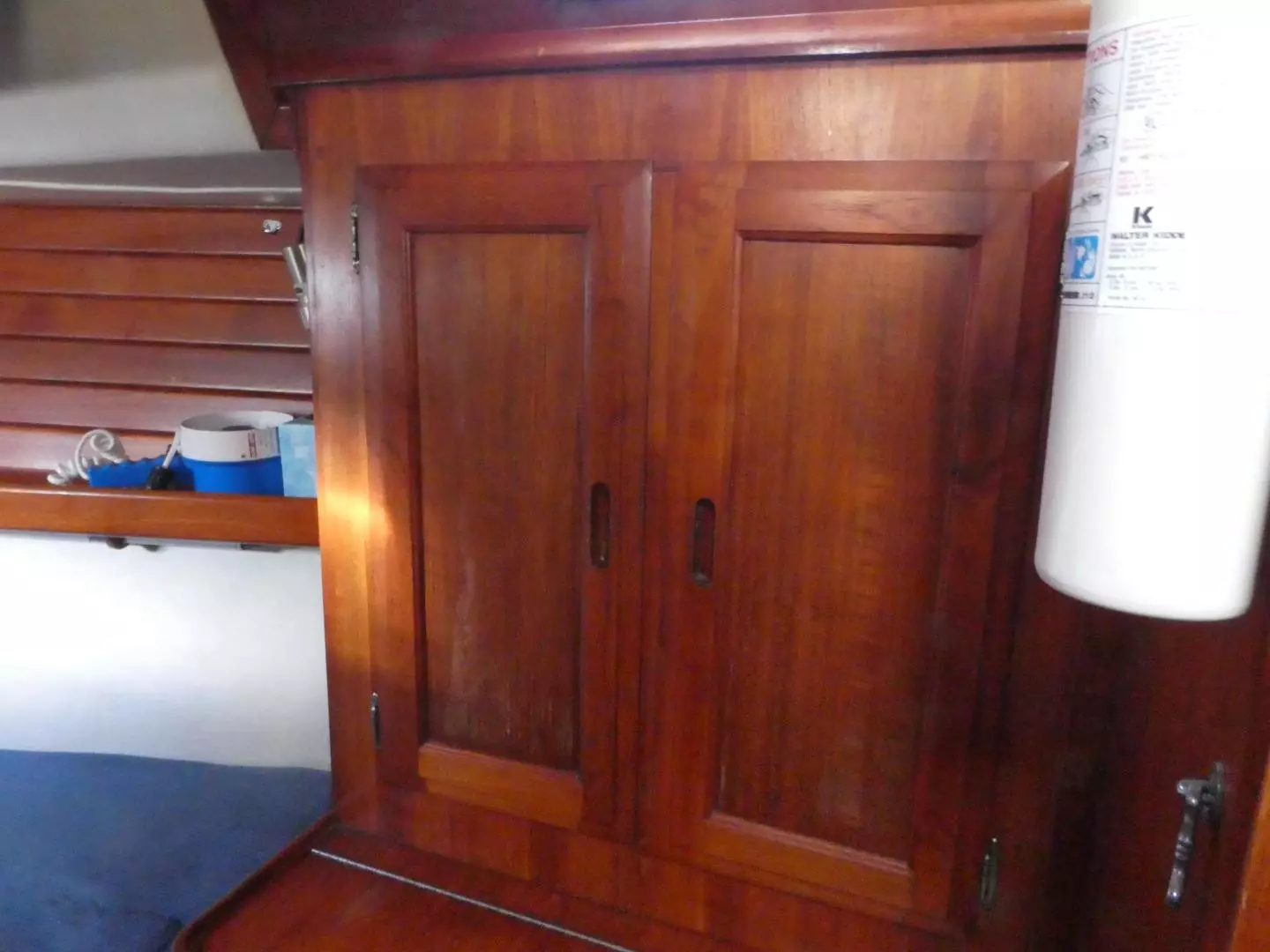 Forward one will find a spacious double V berth, with it's own privacy door and is arranged with a surprising amount of storage on both sides of the cabin and in central drawers beneath the berth.