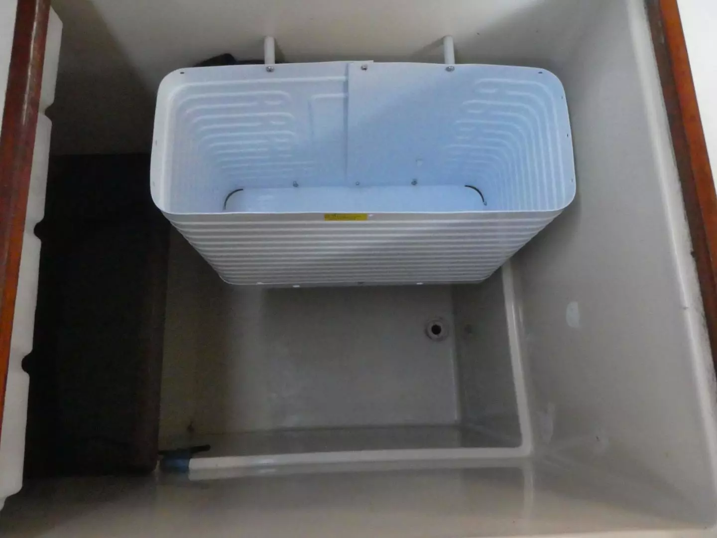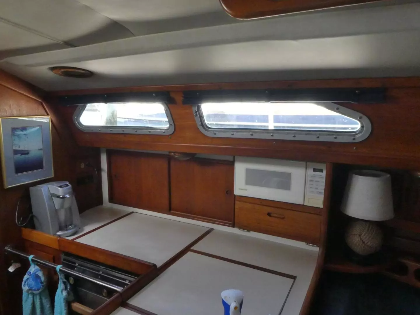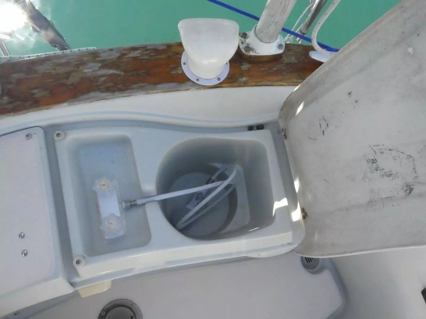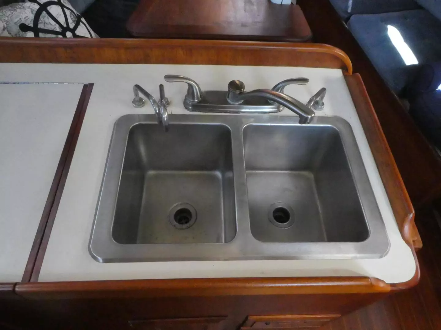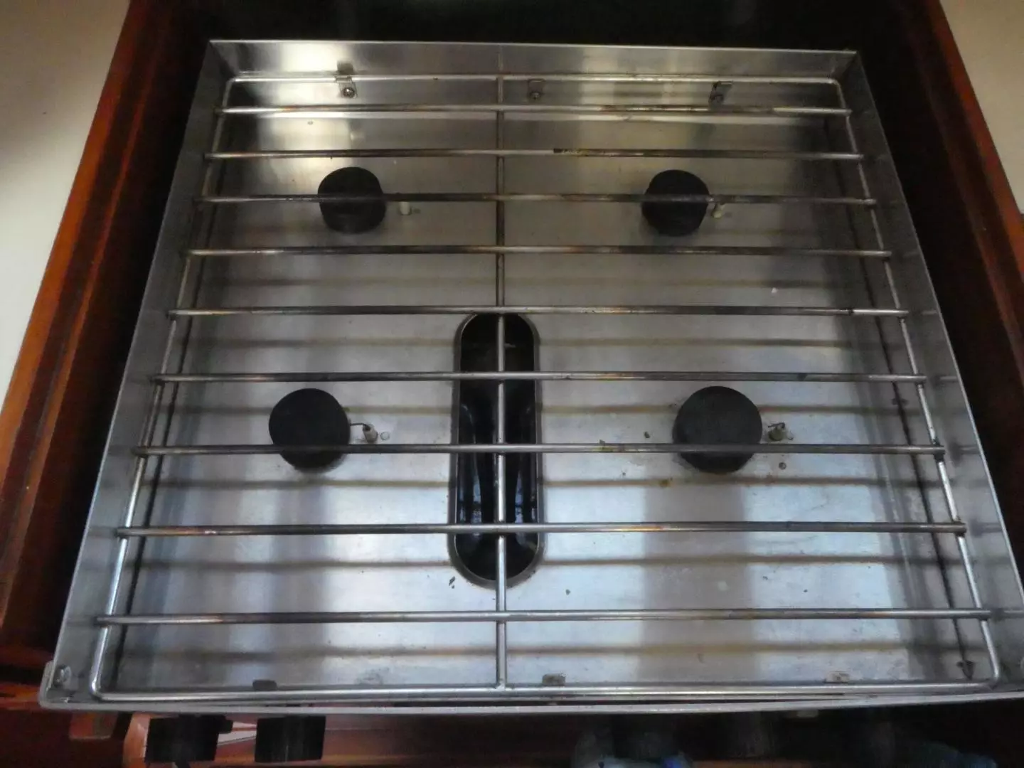 The galley lies to port, just forward of the companion way. This has more than adequate work top space, double drain sink, gas stove with oven and a deep ice box type refrigerator.