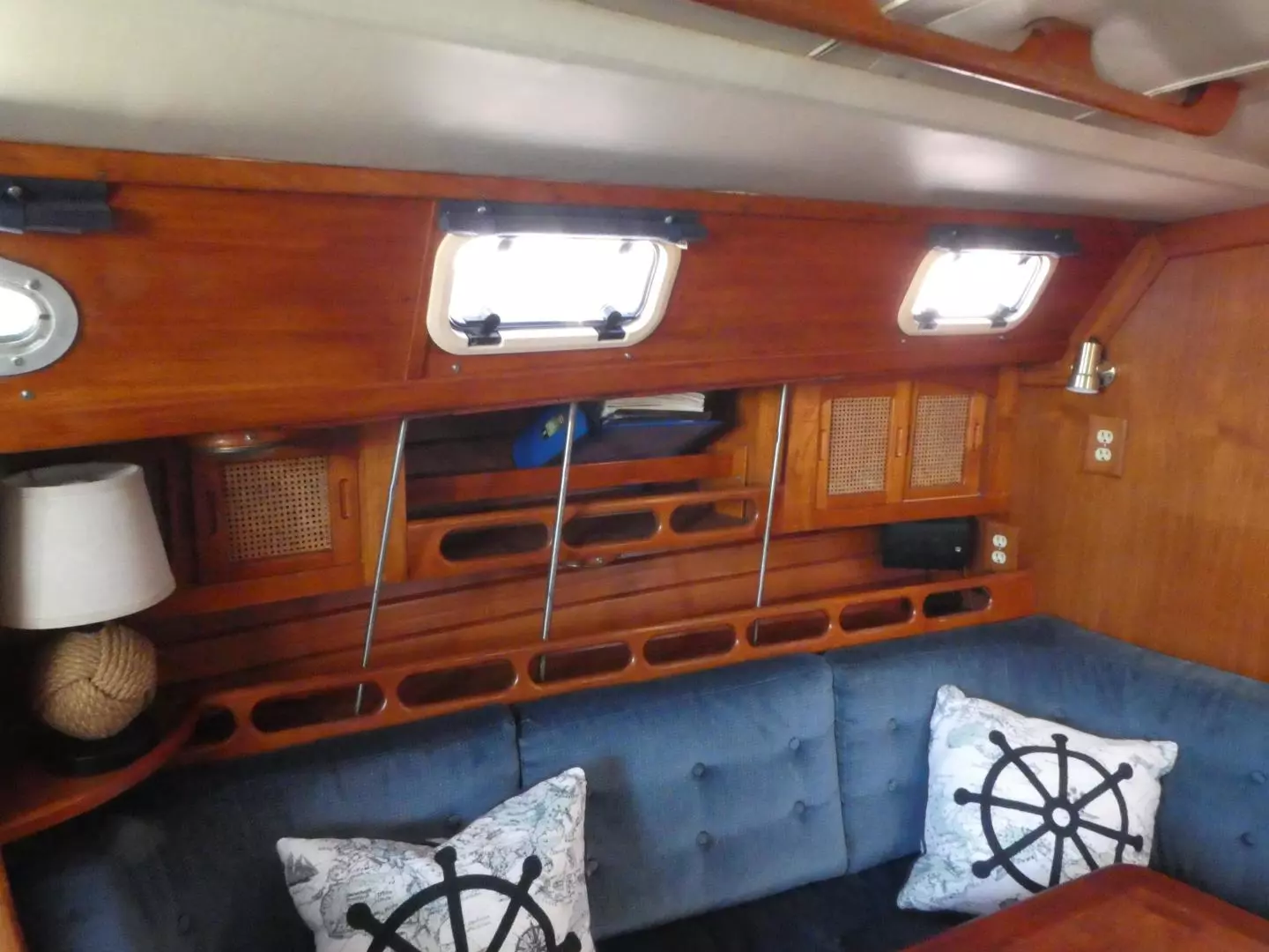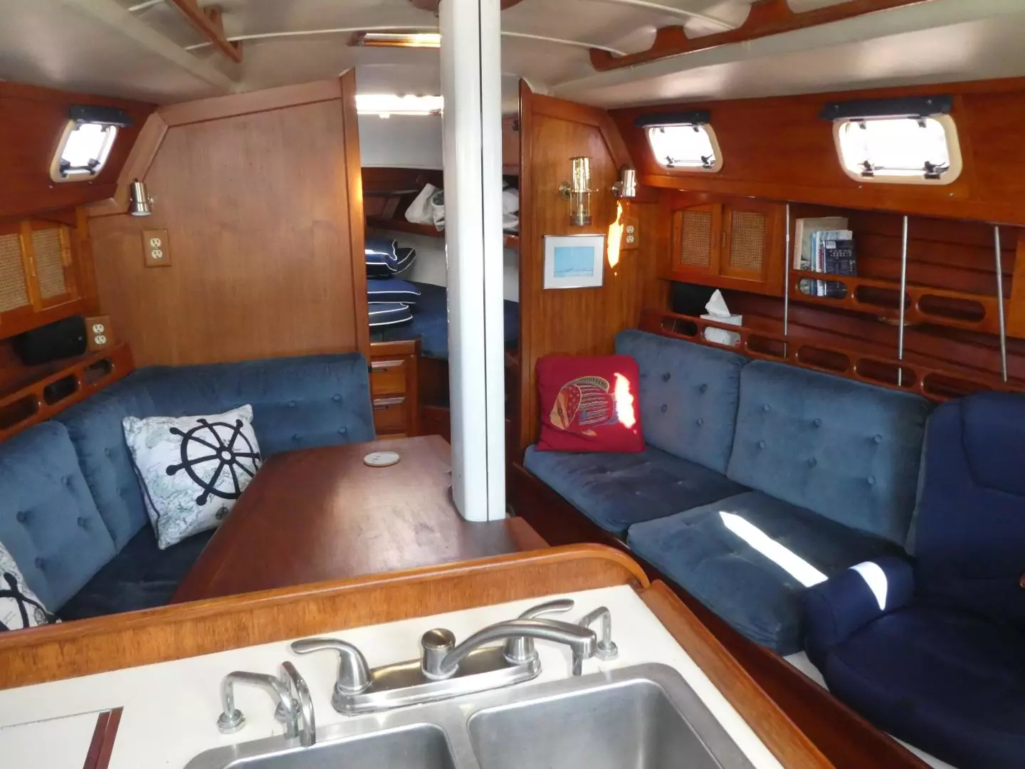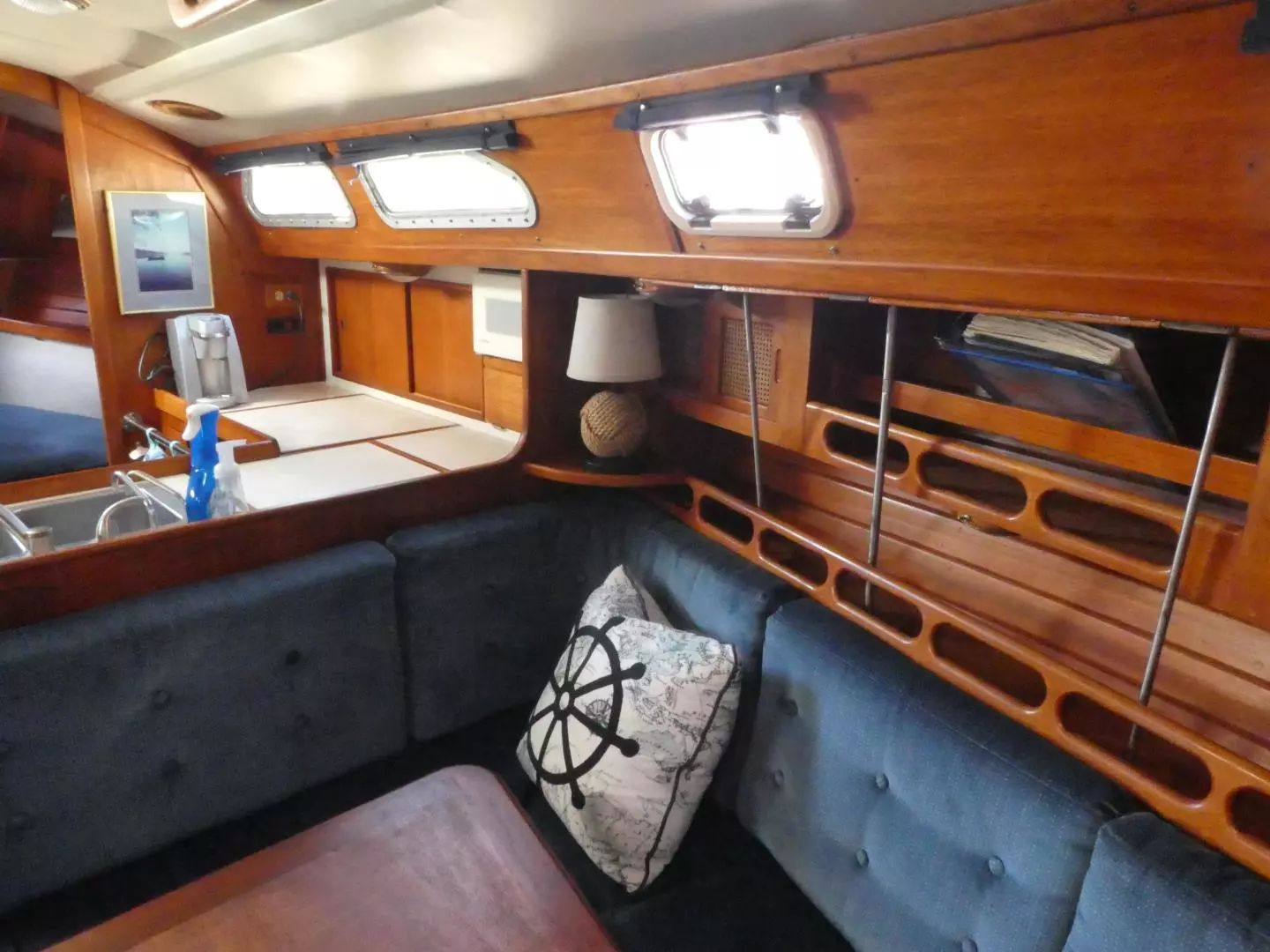 There is another private cabin in the port quarter, with slightly less volume but a slightly wider double bunk. Midships, one will find a spacious salon with U shaped seating to port and fore/aft seating to s'brd, both of which may be used as bunks. 6 persons may easily be accommodated for short periods.