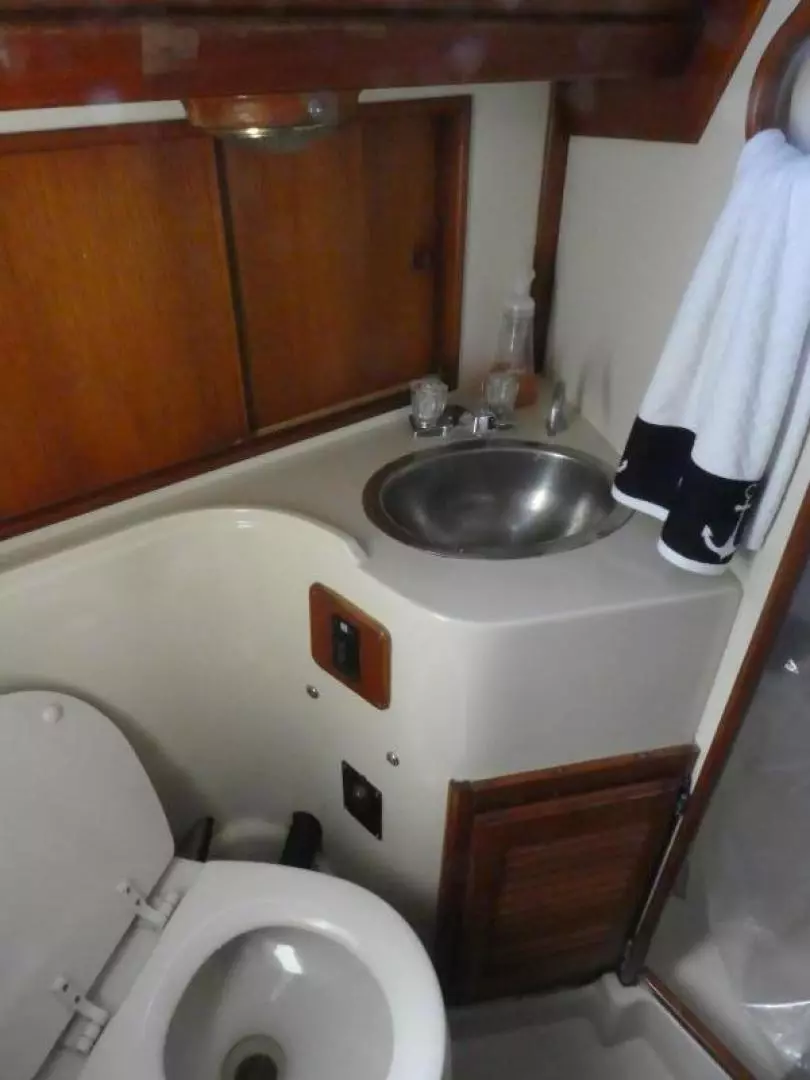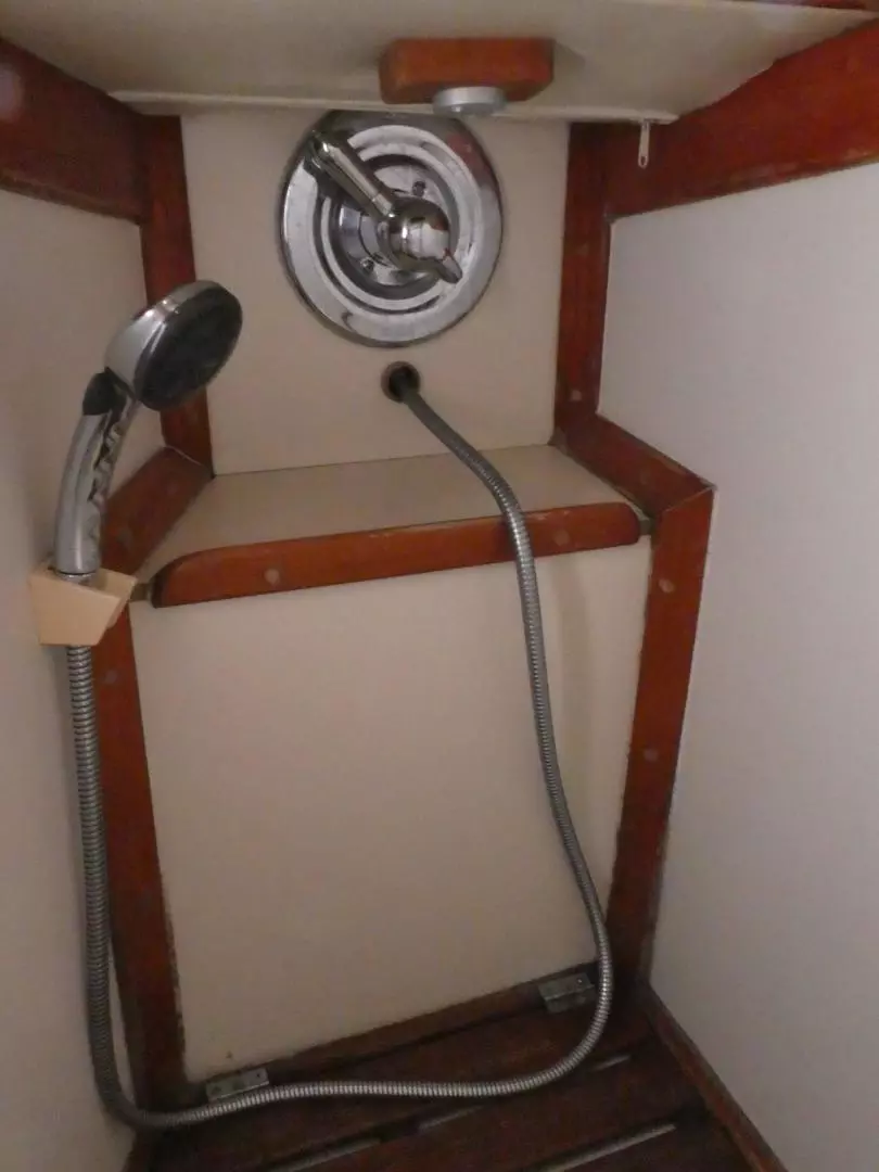 Aft of the chart table, one will find the head, with a separate enclosed shower. Of note, the head is electrically operated and is fresh water supplied from the more than adequate tankage.