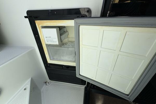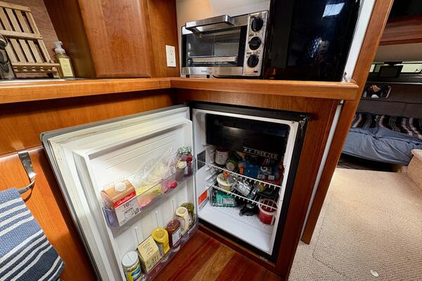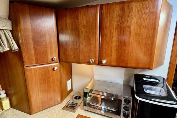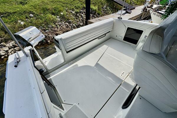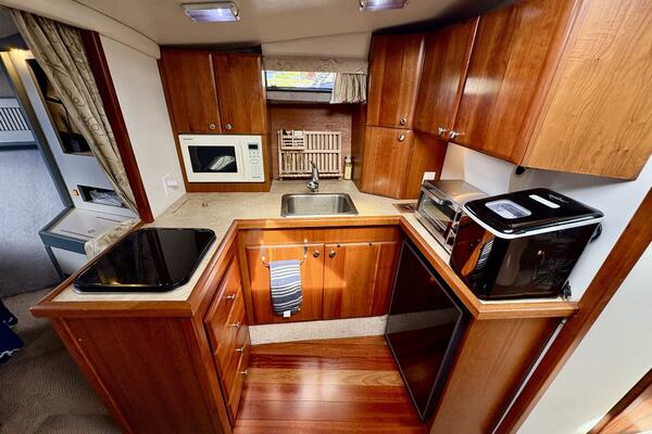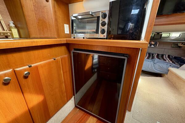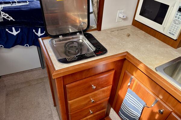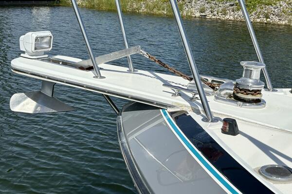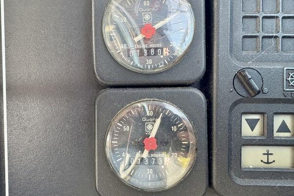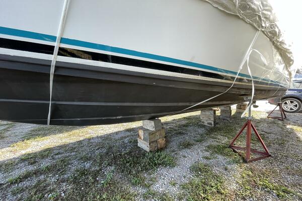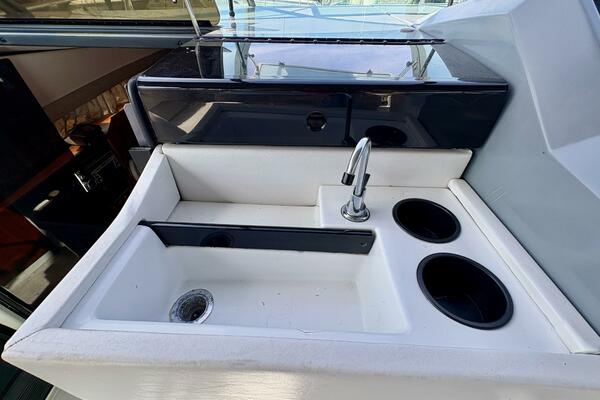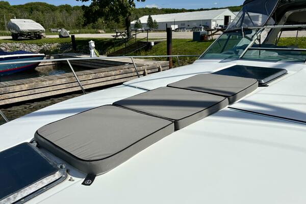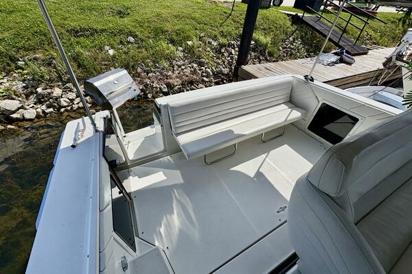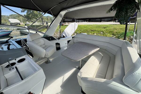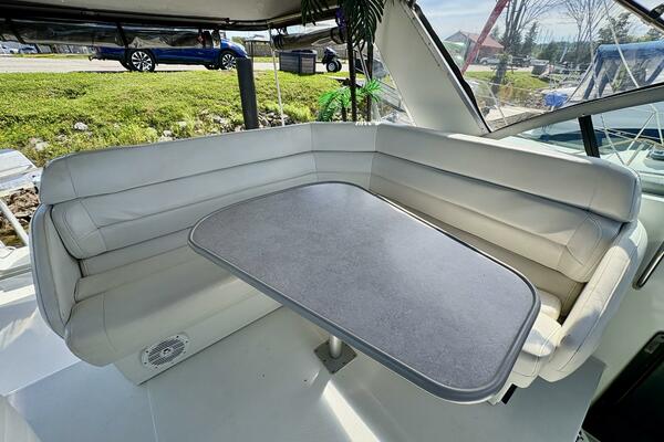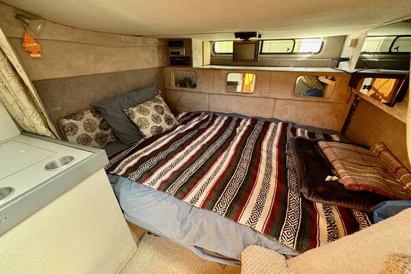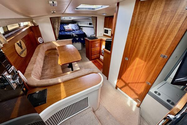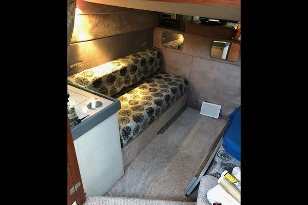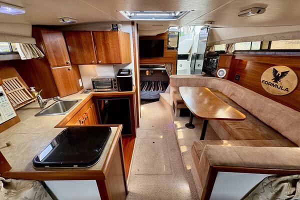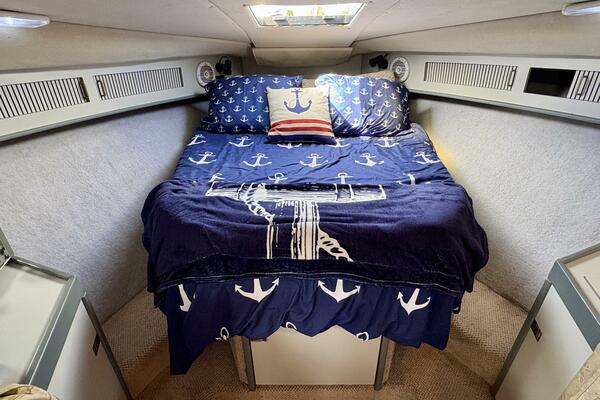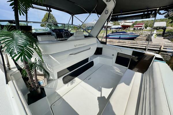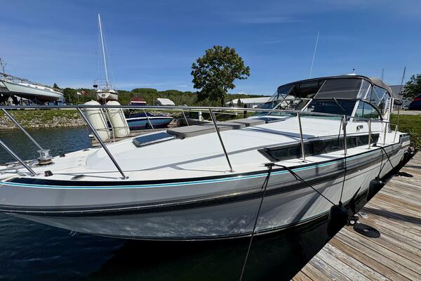 The Largest of the Formula PC (Performance Cruiser) fleet in the late 1980s, the 35 PC is a roomy family express cruiser. The PC's wide-open floorplan includes a superb U-shaped galley area-still among the best found in any express boat this size-and a step-down mid-cabin with facing settees that convert into a big double bed at night. There's a centerline island berth in the forward stateroom (with a draw curtain for night time privacy). The cockpit is arranged with a big L-shaped lounge opposite the helm and foldaway bench seating at the transom. Additional features include side-dumping exhausts, a transom door, bow pulpit, radar arch, and swim platform. Construction is solid fiberglass, and her deep-V hull is designed with prop pockets to reduce the draft. Accessed via a motorized hatch lift, twin 340hp MerCruiser 7.4L Bluewater engines (with V-drives) will cruise the Formula 35 PC at 21-22 knots and reach a top speed of around 30 knots.