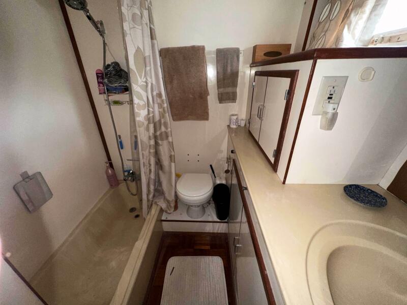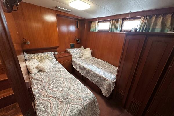 On the starboard side is the entrance to the guest stateroom. Two separate twin beds ,with new mattresses, a hanging locker, night stand, and large storage drawers under the beds. This stateroom has an independent heating and air-conditioning system.