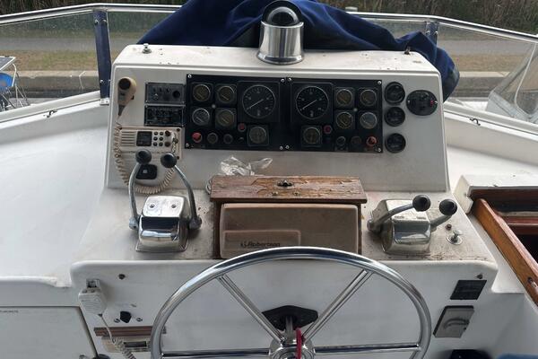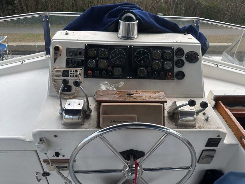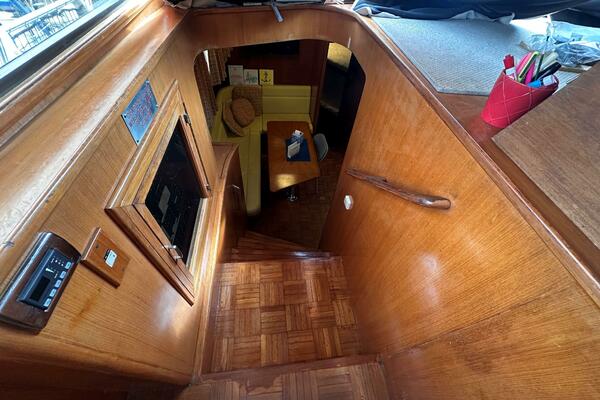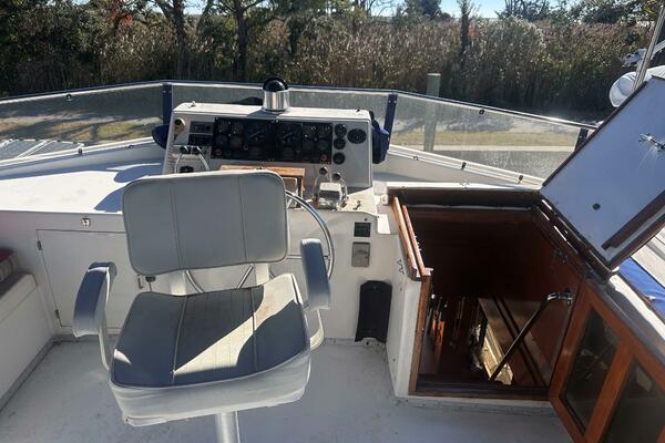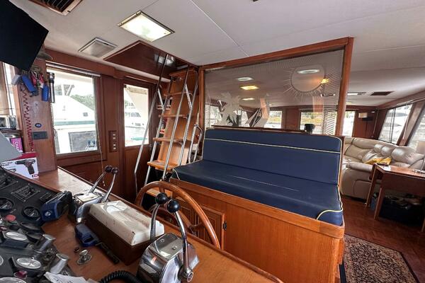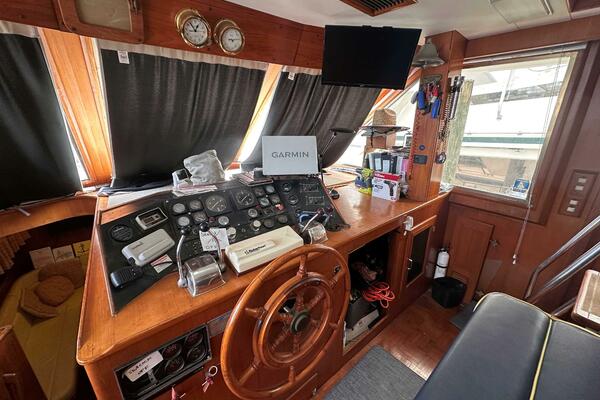 Stepping up five steps going aft from the galley is the pilot house. On the way to the pilot house on the port side is the AC electrical panel. The pilot house contains all the engine and navigation equipment as well as the stairs going up to the bridge deck and a large pilot seat. There is a chart cabinet under the pilot seat. Under the helm there is a large locker containing a 3000 watt inverter charger and two 200 watt hr lithium ion batteries. There are port and starboard doors leading to the outer decks in the pilot house.