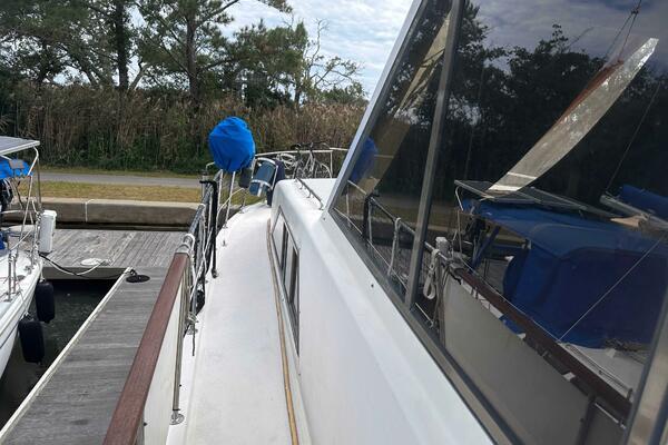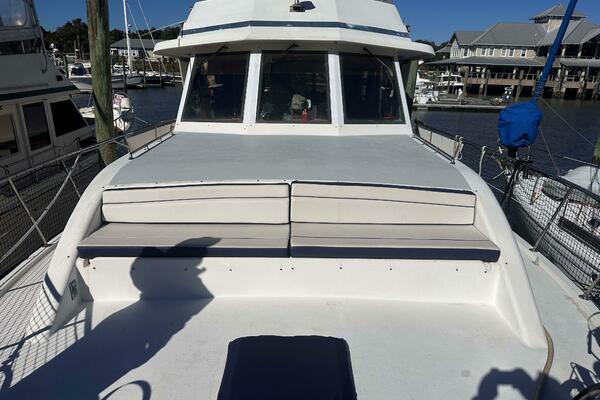 Boarding the boat from the port side and walking all the way forward there is a bow sprint containing an anchor bow roller holding a 65 lb CQR anchor connected to an all chain rode. An electric windless with a gypsy and a chain sprocket is mounted just aft of the bow sprint. A foot switch controlling the windless chain retrieval is mounted just starboard. There are several fender holders mounted on the rails both port and starboard. A hatch leading to the crew quarters is located several feet aft of the bow. A lunch hook is mounted on the port side of the foredeck with the rode stowed in one of the two lockers under the forward foredeck bench seating. The bench seat cushions are new with new Sailrite material protective covers.