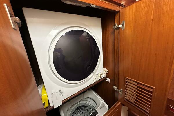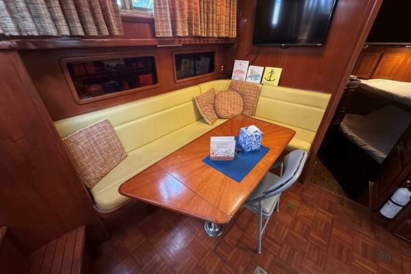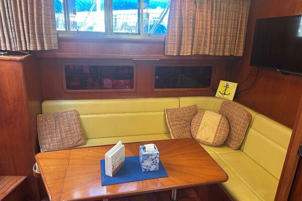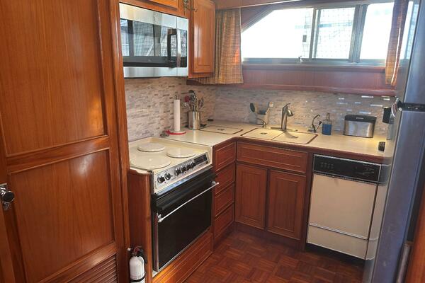Moving aft , up three steps, from the crew quarters to amidship is the full size galley. A four burner electric stove with oven, new full size microwave, large SS sink, apartment size dish washer, and a new full size refrigerator/freezer (drawing only 2.7 amps) starboard side in a "U" shape complete the appliances. Port side there is an "L" shaped dinette seating five. The galley also contains ample storage for long voyages and a wall mounted TV for entertainment. The galley has its own independent air conditioning system.