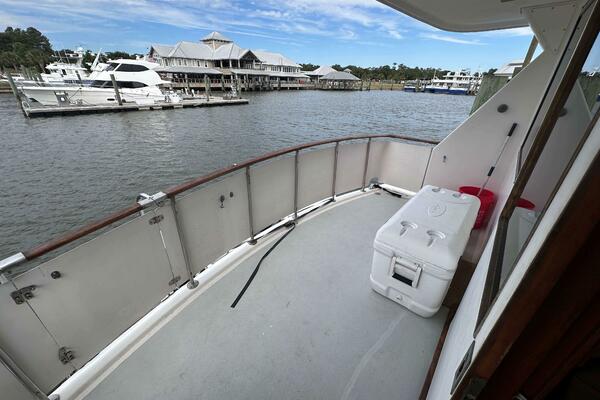 Going aft on the port side is located one of the two pilot house doors, both port and starboard. Stepping through the port door and moving forward there are steps leading down to the full size galley.