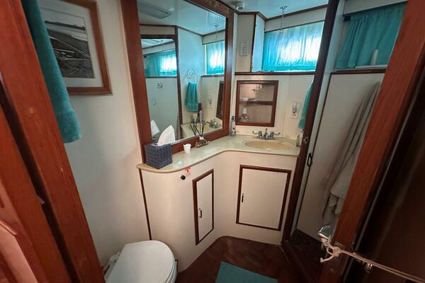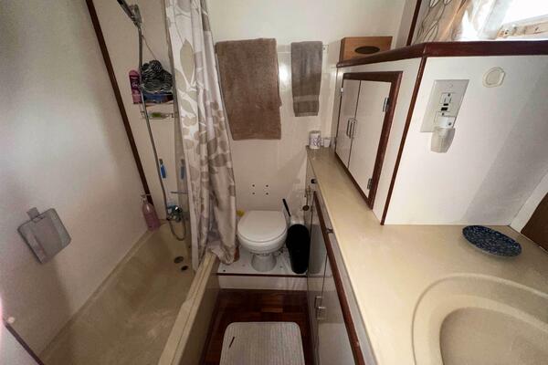 Once in the galley, stepping forward and down three steps is the forward crew quarters. Located there are two oversized bunks starboard with under bunk drawers and a hanging locker to port. Access to the chain locker is located forward. There is also an enclosed head and sink port side with an enclosed shower to starboard. The stateroom also has its own independent heat and air conditioning system.
