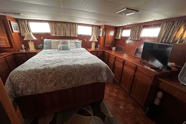 The hallway ends aft with the master stateroom. The master stateroom has a queen size bed, two large hanging lockers, many drawers and lockers for storage, makeup desk with mirror, large wall size mirror, and an en suite head. This stateroom has an independent heating and air-conditioning system.