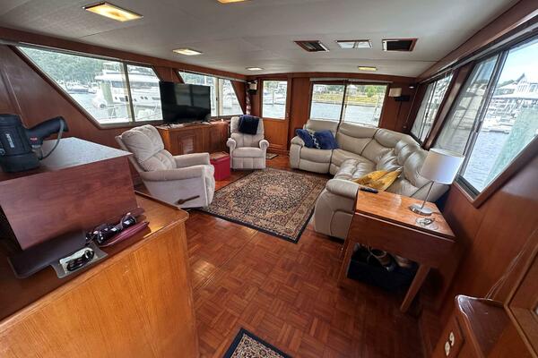 The spacious salon, beginning a few feet aft of the entertainment area on the starboard side, has a large cabinet with lockers and a three tier book shelf running all the way aft. On the port side there is a "L" shaped leather sofa with two intrical electric reclining sections at either end. Large windows, with pull down shades, surround the salon for excellent visibility of your surroundings. The salon has an independent heating and air-conditioning system.