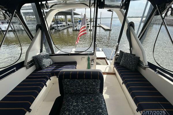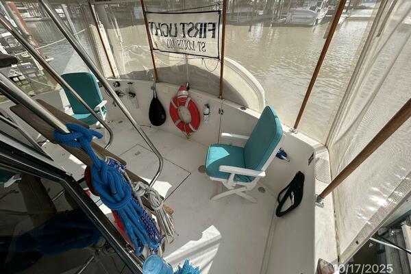 The aftdeck offers a hardtop, non-skid deck, molded-in steps to each side deck, 2 deck chairs, hatch and stainless steel & teak ladder to the flybridge, transom gate, lazarette access, sliding teak & glass door to the salon and sun screens.