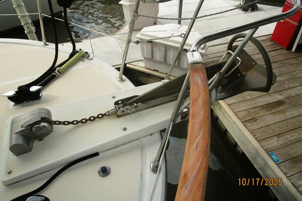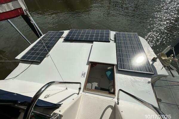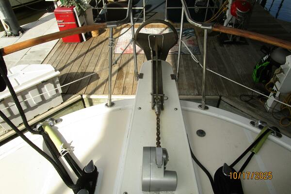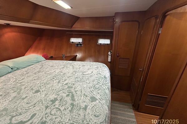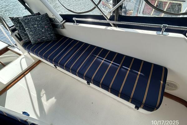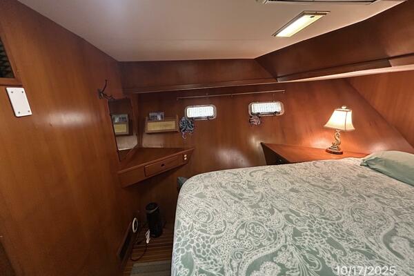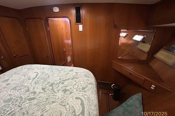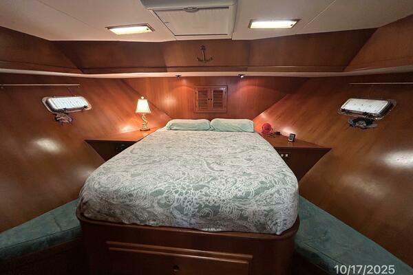 The master stateroom is forward and offers an island queen size berth (High quality custom mattress), nightstands, reading lights, 4 portlights with Clozures blinds, overhead hatch with an Oceanair screen/shade, teak & holly sole, a benchseat with storage on each side, book shelf, mirror, corner desk, hanging locker/cabinet, storage drawers, storage under the berth, anchor chain locker access and direct access to the starboard aft head and 1/2 tub/shower.