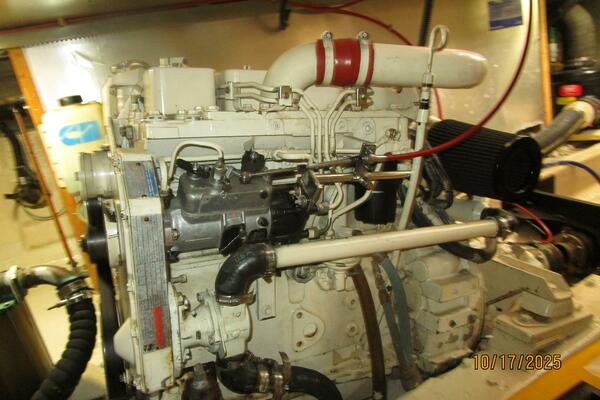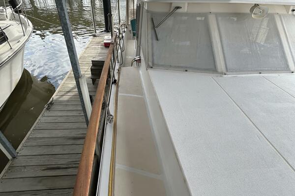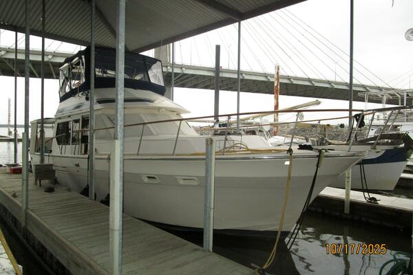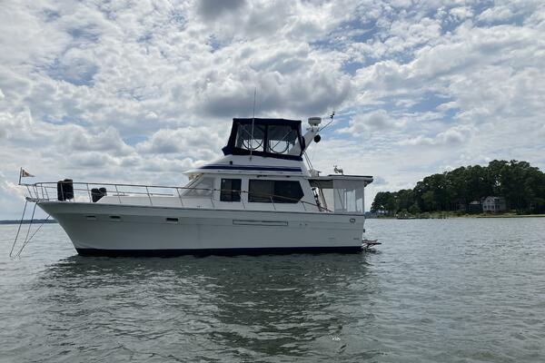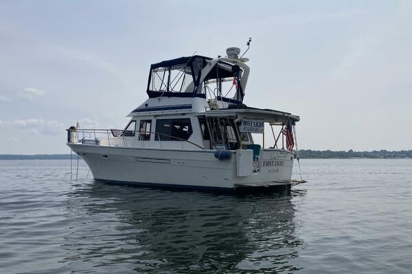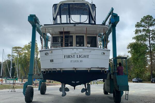 First Light is a 1988 40' Kha Shing flybridge sedan. She offers twin Cummins 150-155 HP main engines (Starboard original and port re-manufactured in 2010), Onan 8 kW generator, Tides dripless shaft seals, solar panels, hinged Radar arch, hardtop covered aftdeck, galley on the main deck and a two stateroom layout. First Light is a Great Loop veteran and has an attainable height above the waterline of 13'4".