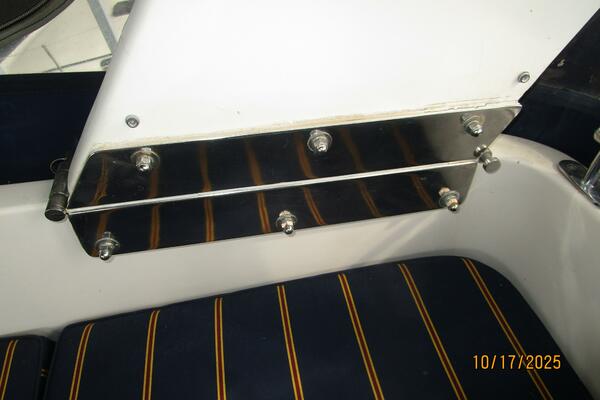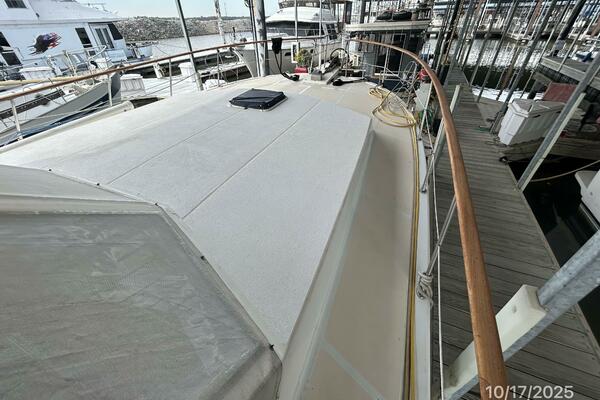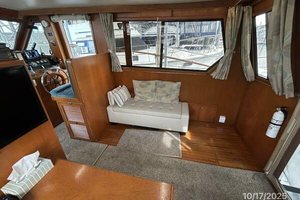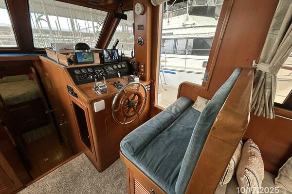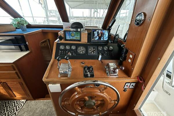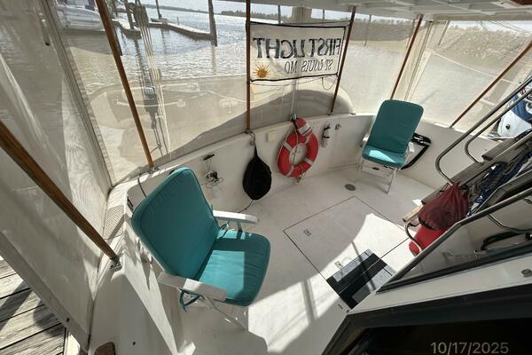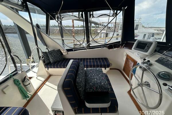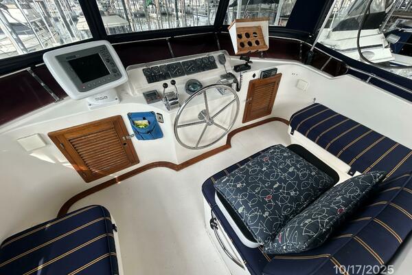 The flybridge offers a non-skid deck, bimini, Eisenglass enclosure, benchseat with storage on each side, helm benchseat, hinged Radar arch, hatch and stainless steel & teak ladder to the aftdeck, storage under the helm, Morse engine controls, anchor windlass control, VDO gauges and electronics and detailed in the electronics section of this presentation.