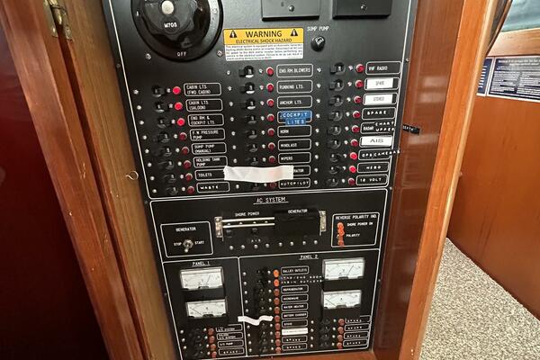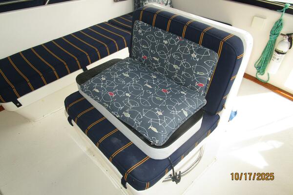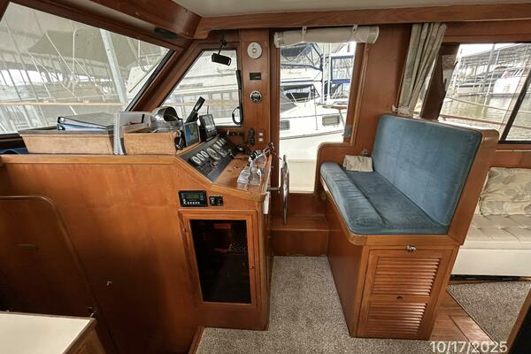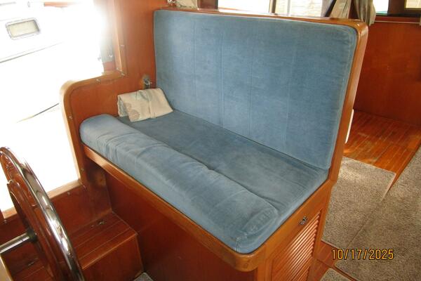 The lower helm is starboard forward in the salon and offers side deck access door, helm benchseat, Morse engine controls, VDO gauges, anchor windlass control, storage under the helm benchseat and electronics as detailed in the electronics section of this presentation.