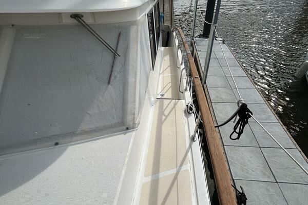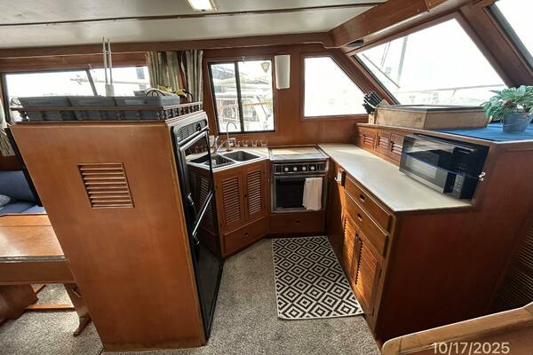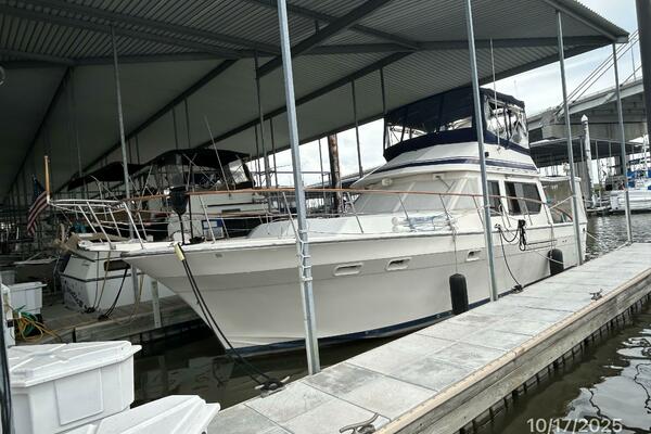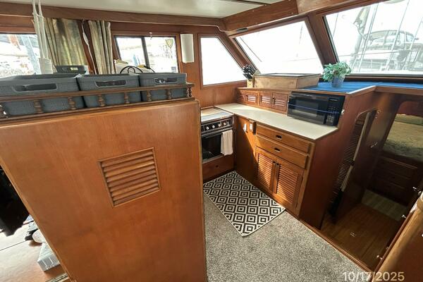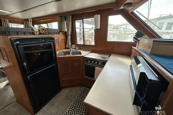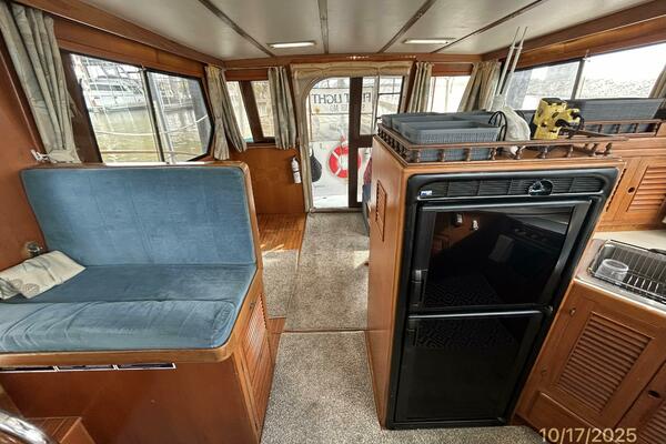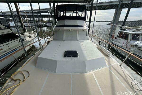 From the teak swimplatform, you enter the hardtop covered aftdeck via the transom gate. Once inside the aftdeck, you will find molded-in steps to each side deck, a stainless steel & teak ladder to the flybridge or you step into the salon via the sliding teak & glass door to the salon. Once inside the salon, you will find a benchseat starboard aft, lower helm with side deck access door starboard forward, L-shaped seating with storage and a hi/lo folding teak table port aft and galley port forward. Walk forward and step down the companionway to find the guest stateroom to port, master stateroom forward and head with a 1/2 tub/shower to starboard.