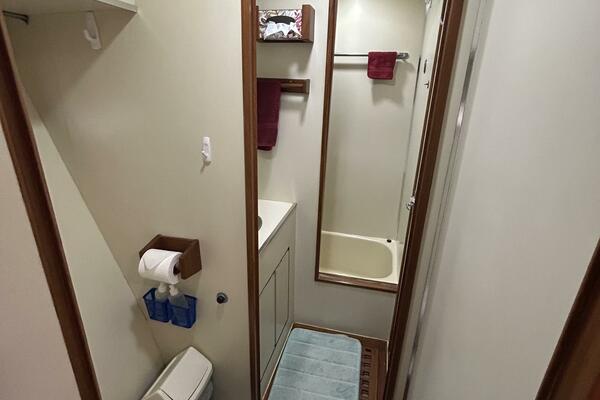 The guest stateroom is to port and offers a double size berth, hanging locker/cabinet, storage cabinet and drawers, shelf, book shelves, storage under the berth, reading light, fans, teak & holly sole and a privacy curtain. The head with a 1/2 tub/shower is to starboard and has access from the companionway.