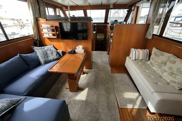 The salon offers a benchseat starboard aft, L-shaped seating with storage and a hi/lo folding teak table port aft, side deck access door starboard forward, screens on the doors, opening side windows with screens and curtains, aft windows, sliding teak & glass door aft, bound carpet over a teak & holly sole, book shelf and Samsung flat screen TV.