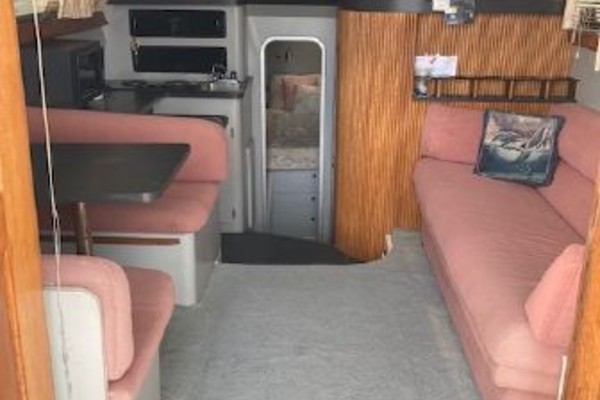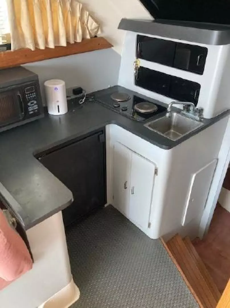 - Galley with 2 burner electric cooktop, microwave, AC/DC refrigerator/freezer
